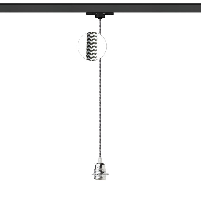 Textilní kabel s kovovou objímkou v různých barevných kombinacích, zakončený adaptérem pro zavěšení do tříokruhové lišty. |