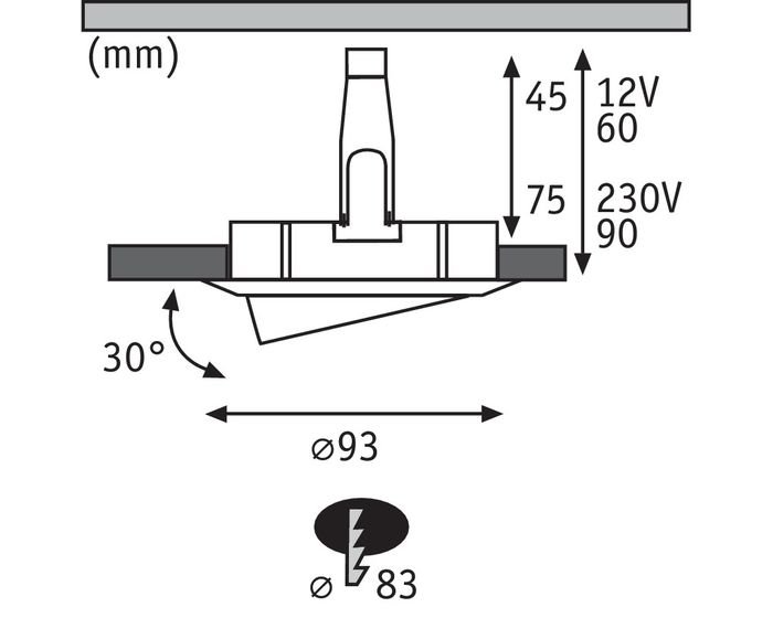 svítidla jsou dodávána jak s objímkou GU10 (230 V), tak i GU5,3 (12 V - vyžadující trafo) - min. zápustná hloubka se liší podle použité objímky