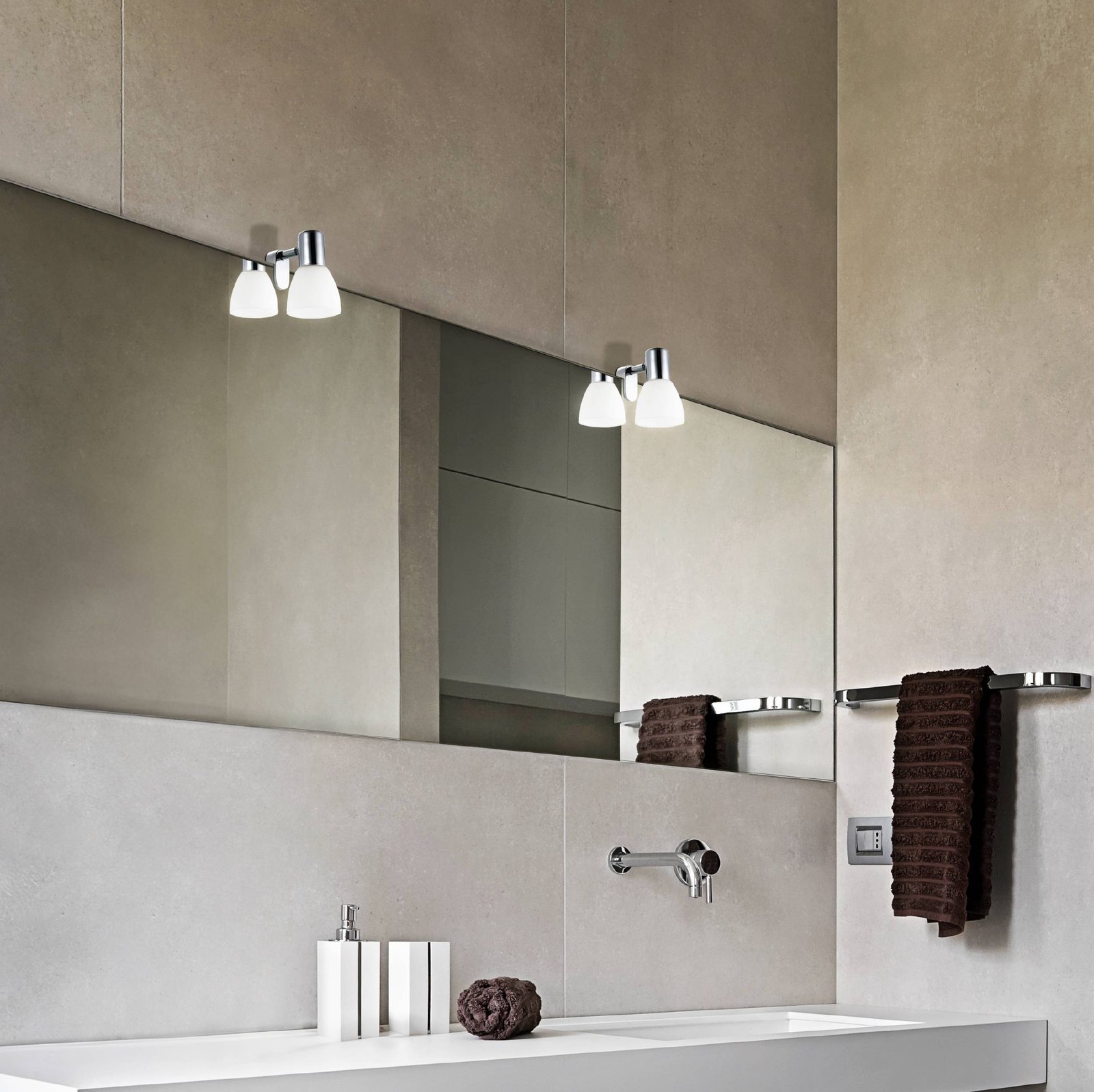 Nástěnná lampička vhodná nad zrcadlo do chodby. Je vyrobena z oceli v barvě chromu a z matného opálového skla v bílé barvě.
