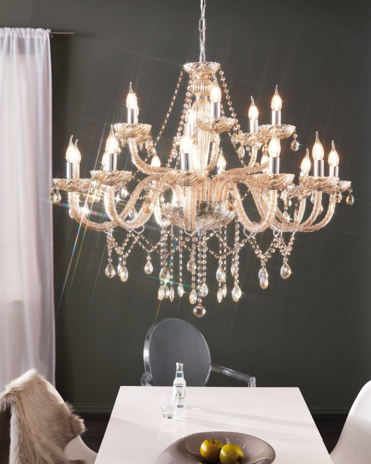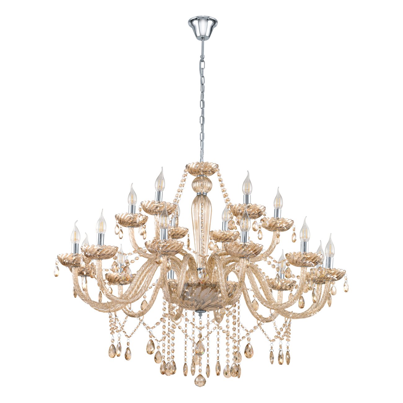 Basilano jsou lustry v klasickém stylu. Jsou vyrobeny z oceli v barvě chromu a skla v barvě koňaku. |