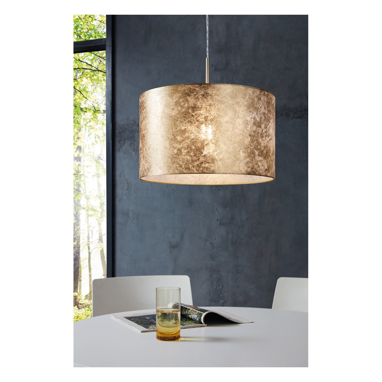 Moderní svítidla Viserbella jsou vyrobena z oceli v barvě champagne a textilu v barvě zlata. |