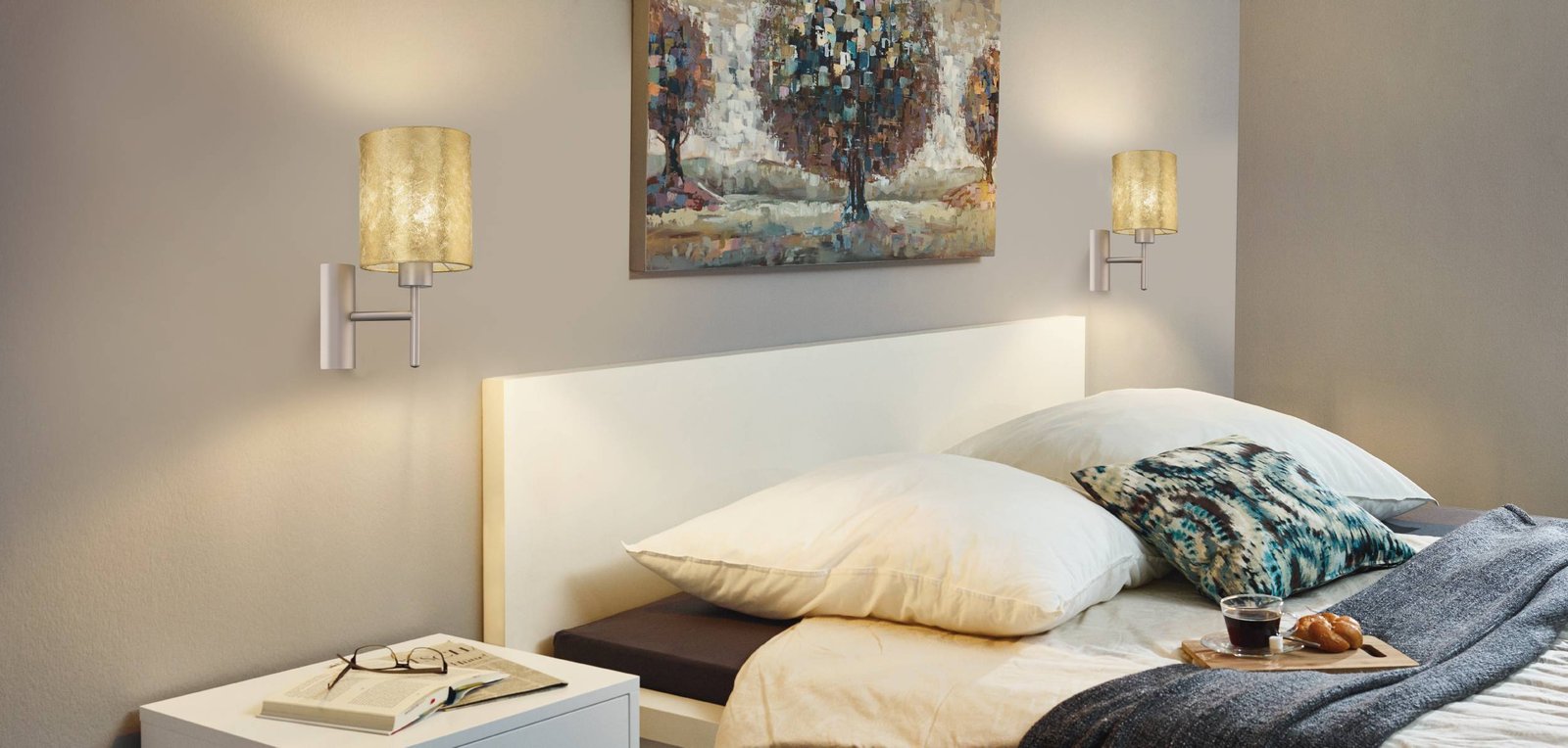 Moderní svítidla Viserbella jsou vyrobena z oceli v barvě champagne a textilu v barvě zlata. |