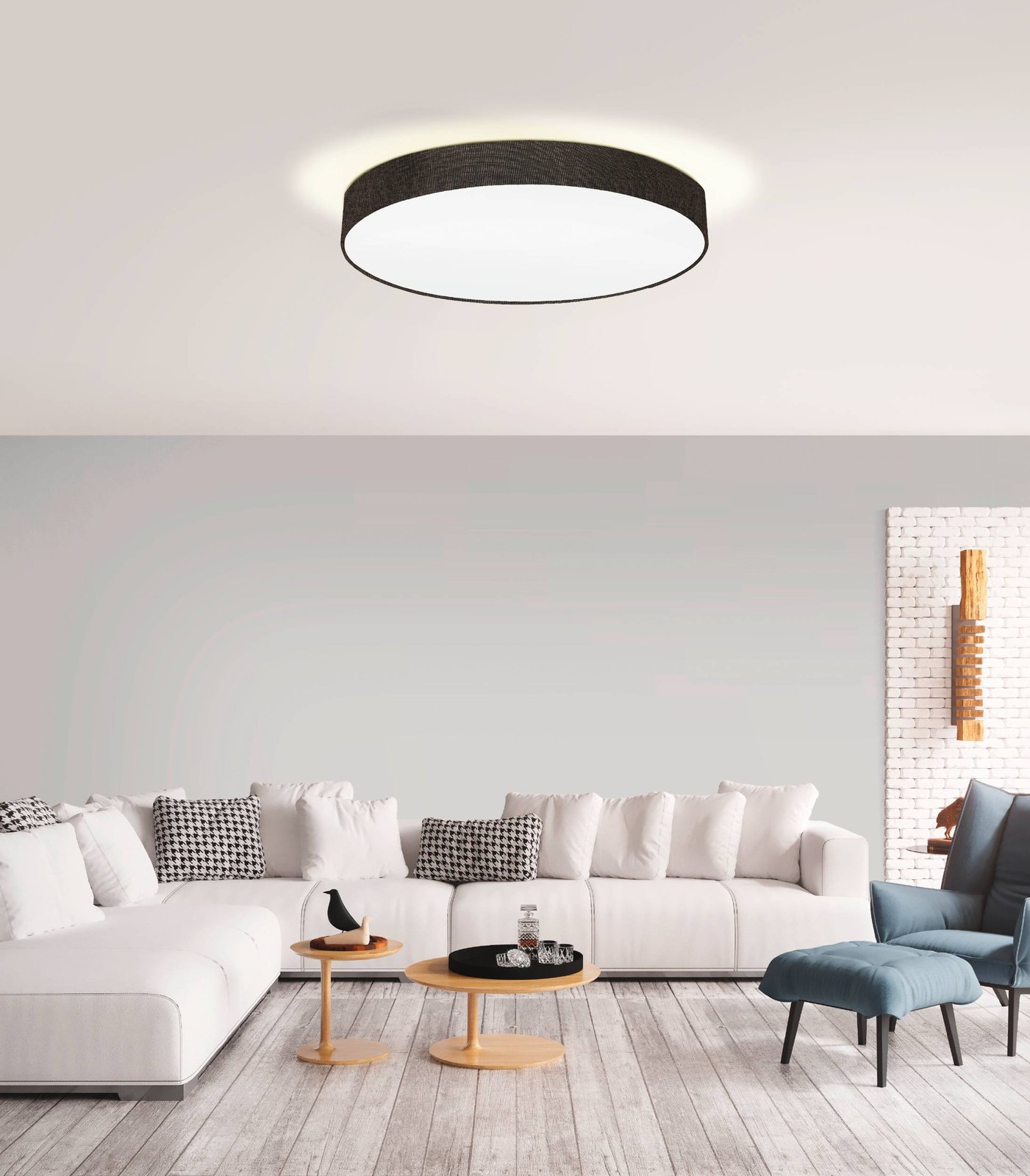 Kulatá stropní svítidla vhodná do všech interiérů. Jsou vyrobená z oceli v bílé barvě a z textilu v hnědé a bílé barvě. Vyjímat se budou především v obývacím pokoji, ale také v ložnici, pracovně nebo předsíni.