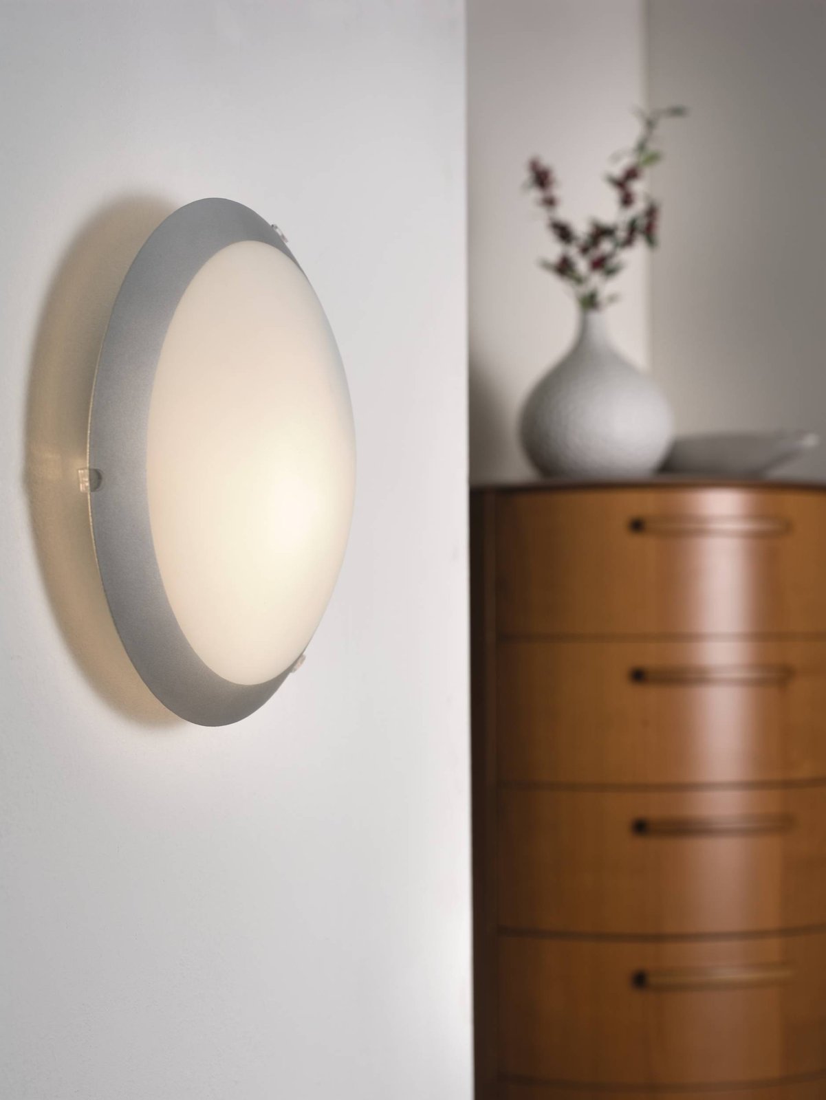 Jednoduchá stropní svítidla vyrobená z kovu a satinovaného bílého skla. Lze je osadit také na stěnu. Svou jednoduchostí jsou vhodná jak do chodeb, tak obývacích prostor, či pracoven. |
