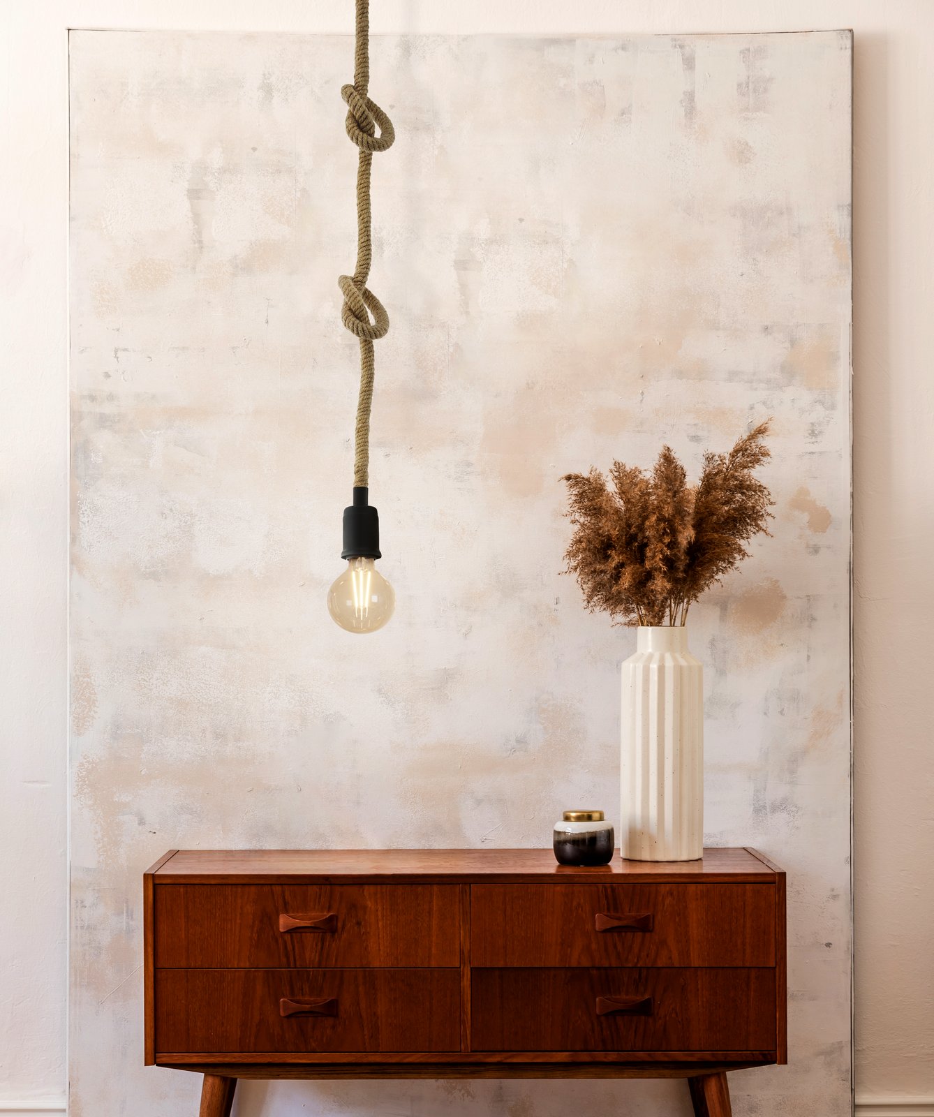 Stylová svítidla ve vintage stylu vhodná do kuchyní, jídelen a obývacích pokojů. Jsou vyrobena z oceli a provazu, na kterém jsou umístěny snítidla. |