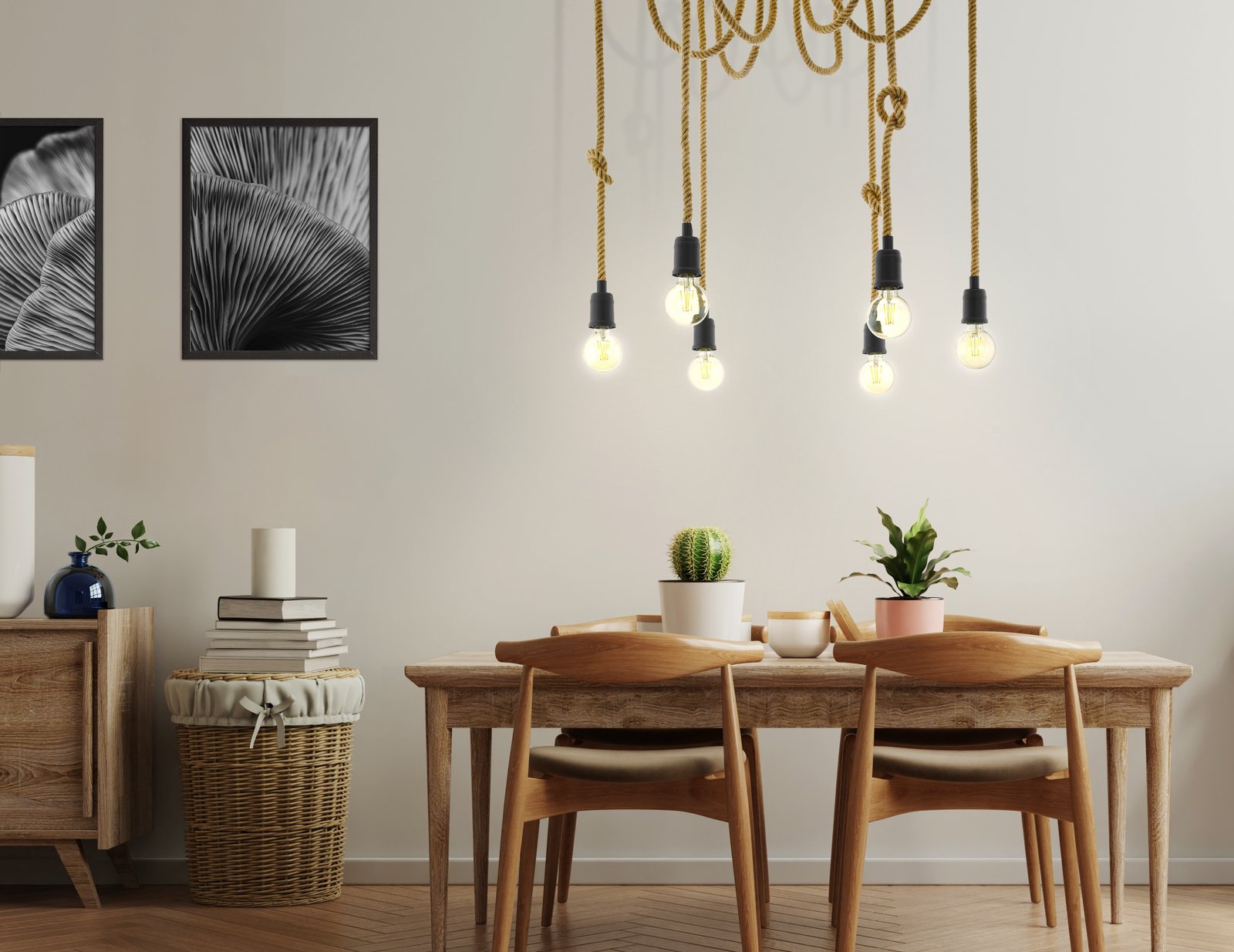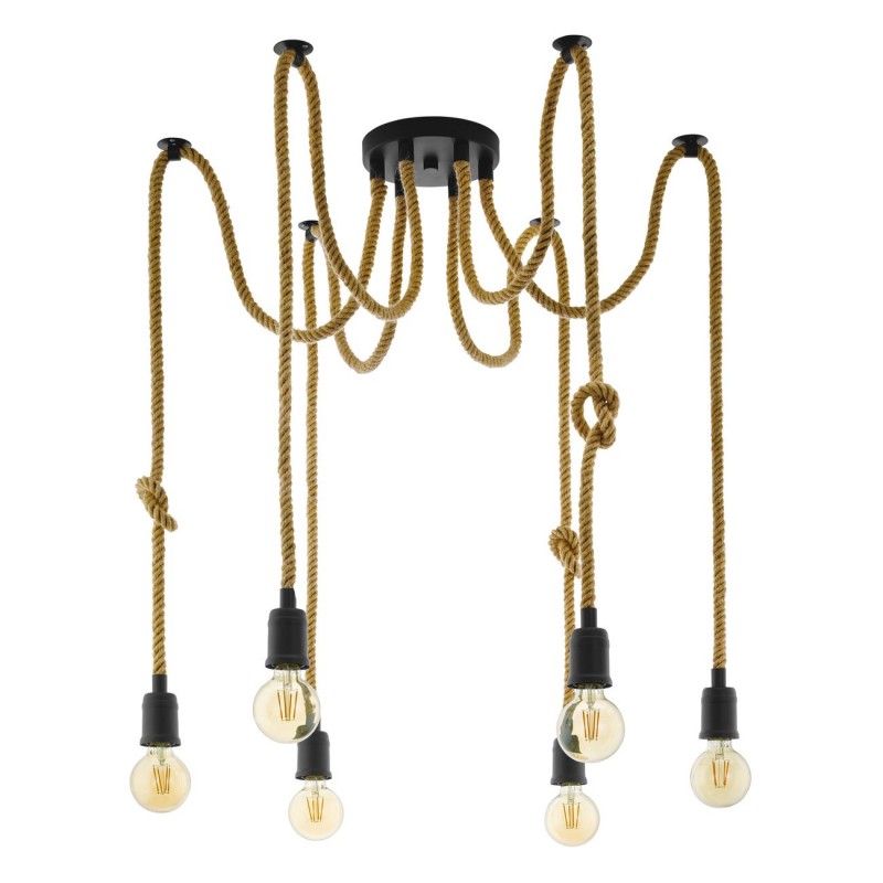Stylová svítidla ve vintage stylu vhodná do kuchyní, jídelen a obývacích pokojů. Jsou vyrobena z oceli a provazu, na kterém jsou umístěny snítidla. |