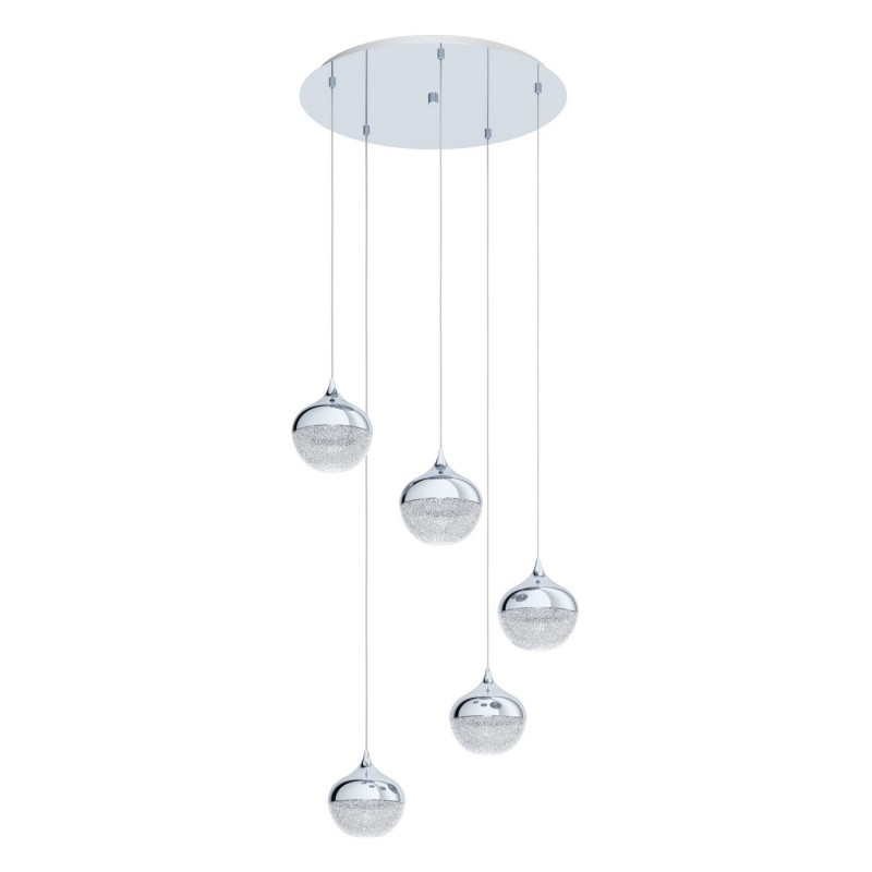 Zajímavé moderní lustry vhodné především do obývacího pokoje, kuchyně a jídelny. Základna je vyrobena z oceli v chromové barvě a stínidlo ve tvaru koule je z plastu v čiré barvě s bílými granulemi, které se po rozsvícení třpití a svítidlu dodávají nádech luxusu. |