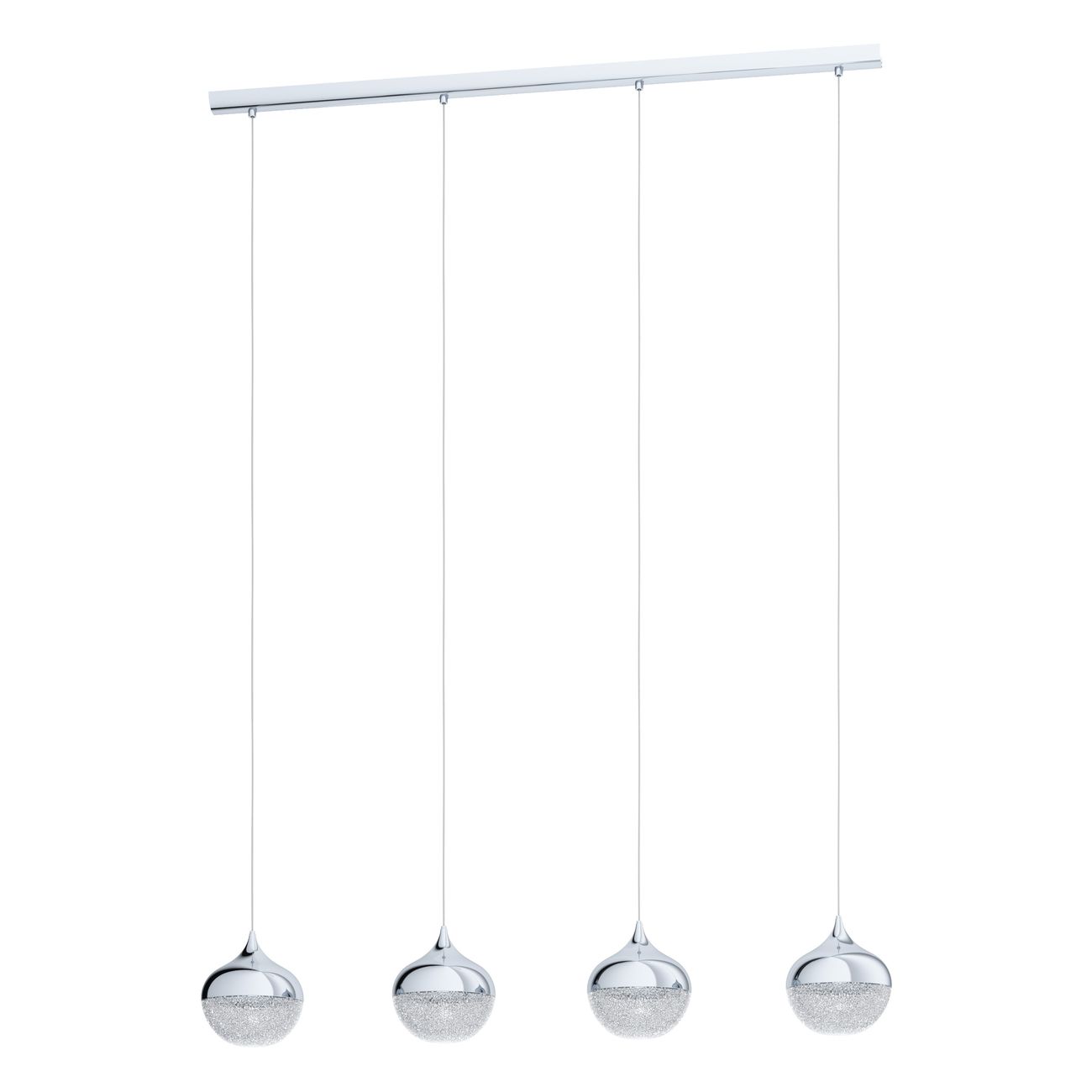 Zajímavé moderní lustry vhodné především do obývacího pokoje, kuchyně a jídelny. Základna je vyrobena z oceli v chromové barvě a stínidlo ve tvaru koule je z plastu v čiré barvě s bílými granulemi, které se po rozsvícení třpití a svítidlu dodávají nádech luxusu. |