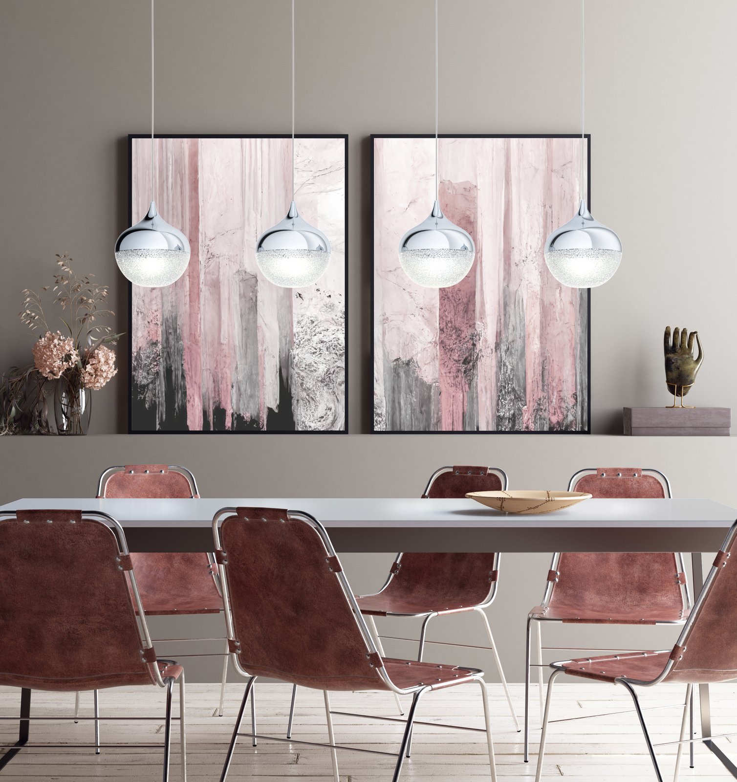 Zajímavé moderní lustry vhodné především do obývacího pokoje, kuchyně a jídelny. Základna je vyrobena z oceli v chromové barvě a stínidlo ve tvaru koule je z plastu v čiré barvě s bílými granulemi, které se po rozsvícení třpití a svítidlu dodávají nádech luxusu. |