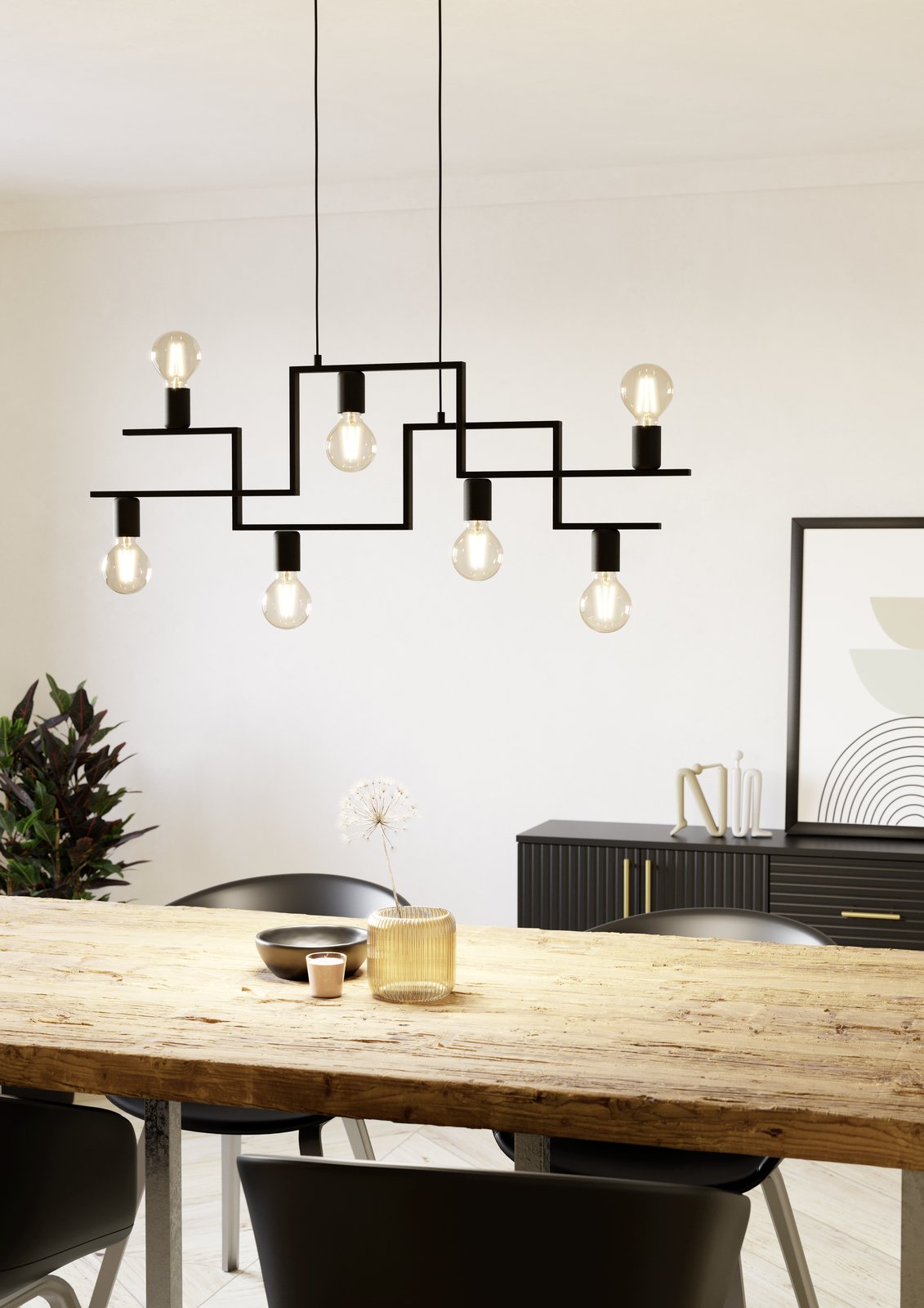 Designový a stylový lustr vhodný do obývacích pokojů, kuchyní i jídelen. Je vyroben z oceli v černé barvě. |