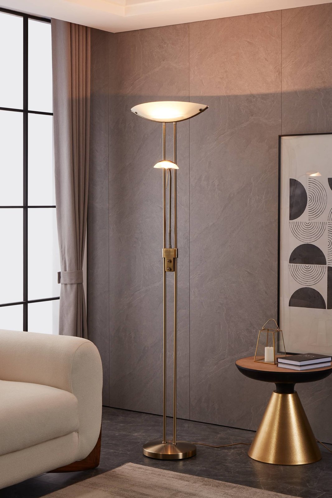 Lampy vyrobené z oceli a satinovaného skla. Mají přídavné rameno, které lze stejně jako hlavní stínidlo stmívat a volit tak vhodnou intenzitu svícení např. při čtení. |