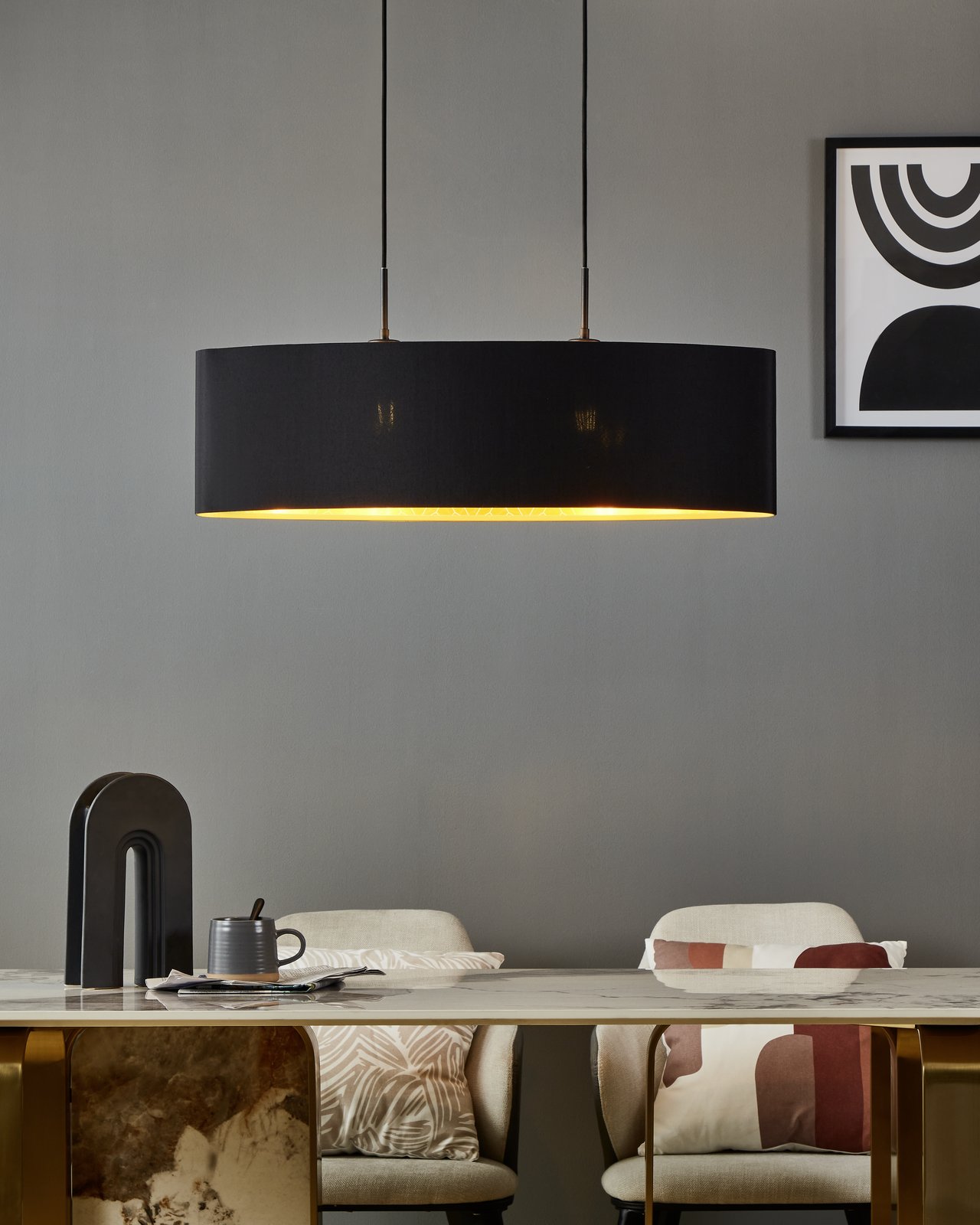 Moderní a elegantní svítidla vyrobená z oceli v černé barvě a textilu v černé a zlaté barvě s dekorem. Jsou vhodná do celého interiéru. Vyjímat se budou v obývacím pokoji, kuchyni, jídelně, ložnici i předsíni. Je možné je osadit chytrou LED žárovkou a pomocí aplikace v chytrém telefonu je stmívat a měnit teplotu a barvu svícení. |