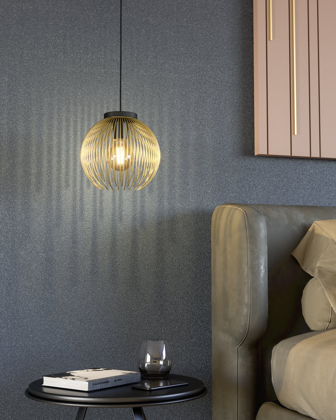 Moderní a stylová svítidla vyrobená z oceli v černé a zlaté barvě. Stínidlo je z ocelových drátů ve tvaru koule. Po rozsvícení světlo prochází stínidlem, což vypadá velmi efektně. Jsou vhodná do obývacích pokojů, kuchyní, jídelen ale i ložnic. |