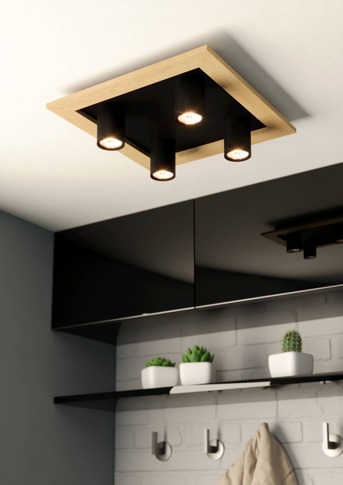 Moderní stropní svítidla vyrobená z oceli v černé barvě a ze dřeva v hnědé barvě. Jsou vhodná nejen do obývacích pokojů, ale i chodeb a předsíní.