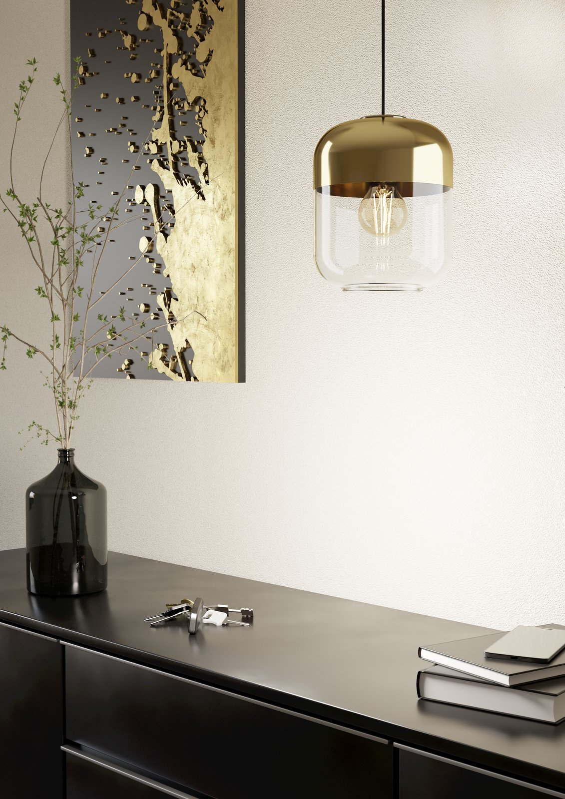 Moderní a stylové lustry vhodné do obývacích pokojů, kuchyní a jídelen. Nad jídelním stolem nebo kuchyňským ostrůvkem můžete tímto svítidlem vytvořit zajímavý prvek. Lustry jsou vyrobeny z oceli v černé a bronzové barvě a skleněné stínidlo je v barvě čiré a zlaté. Doladit můžete ještě výběrem vhodné žárovky. |
