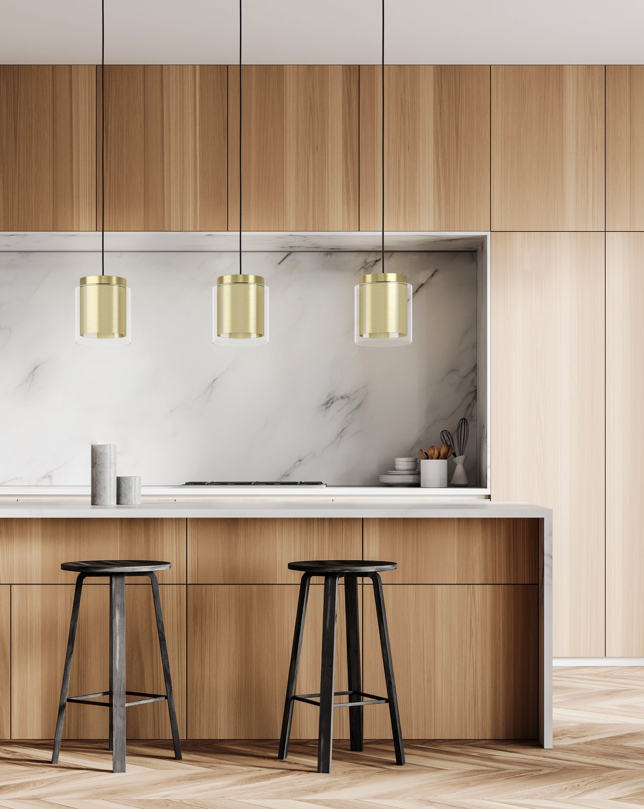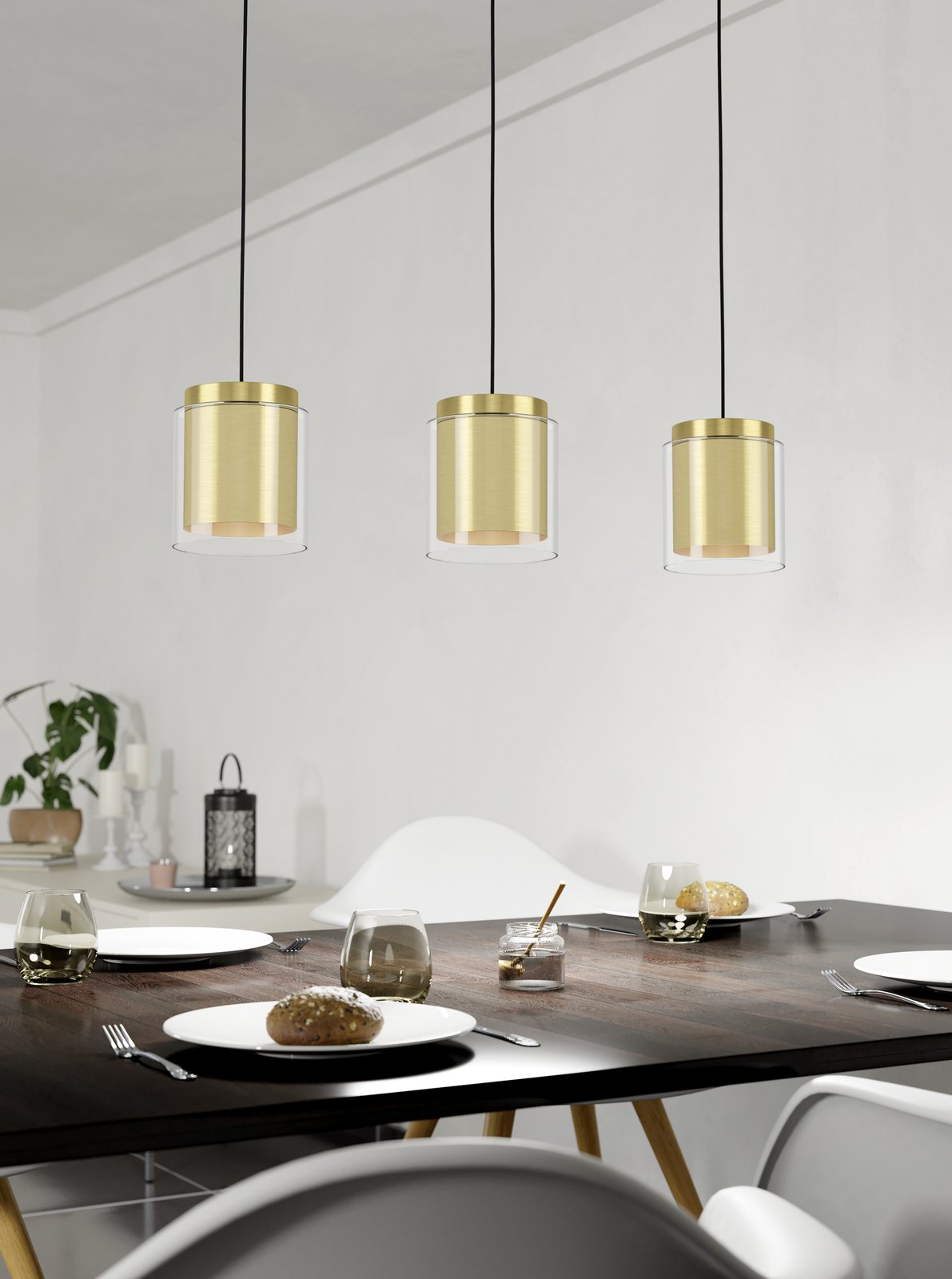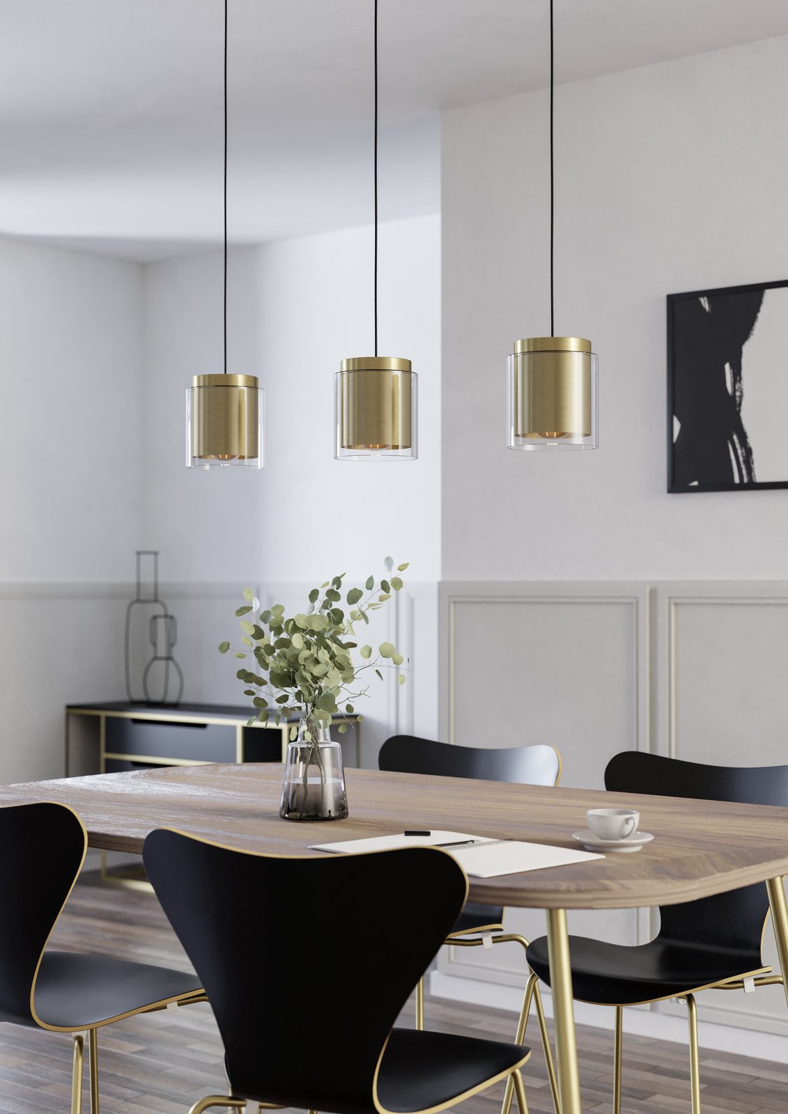 Moderní závěsná svítidla vhodná do obývacích pokojů, kuchyní nad kuchyňský ostrůvek i jídelen nad jídelní stůl. Základna je vyrobena z oceli v černé barvě, kloubouk je z oceli v mosazné a zlaté barvě a ze skla v čiré barvě. |