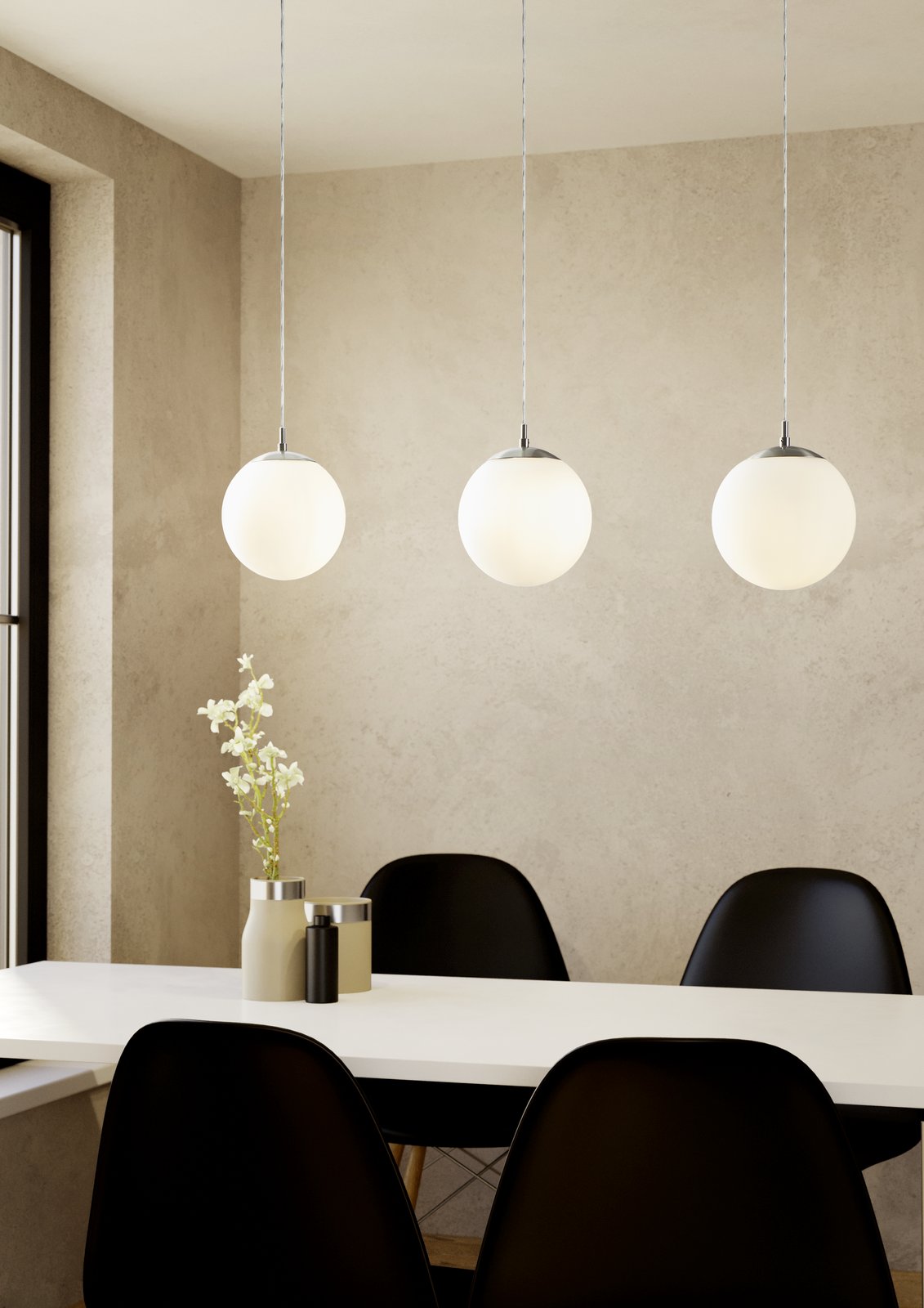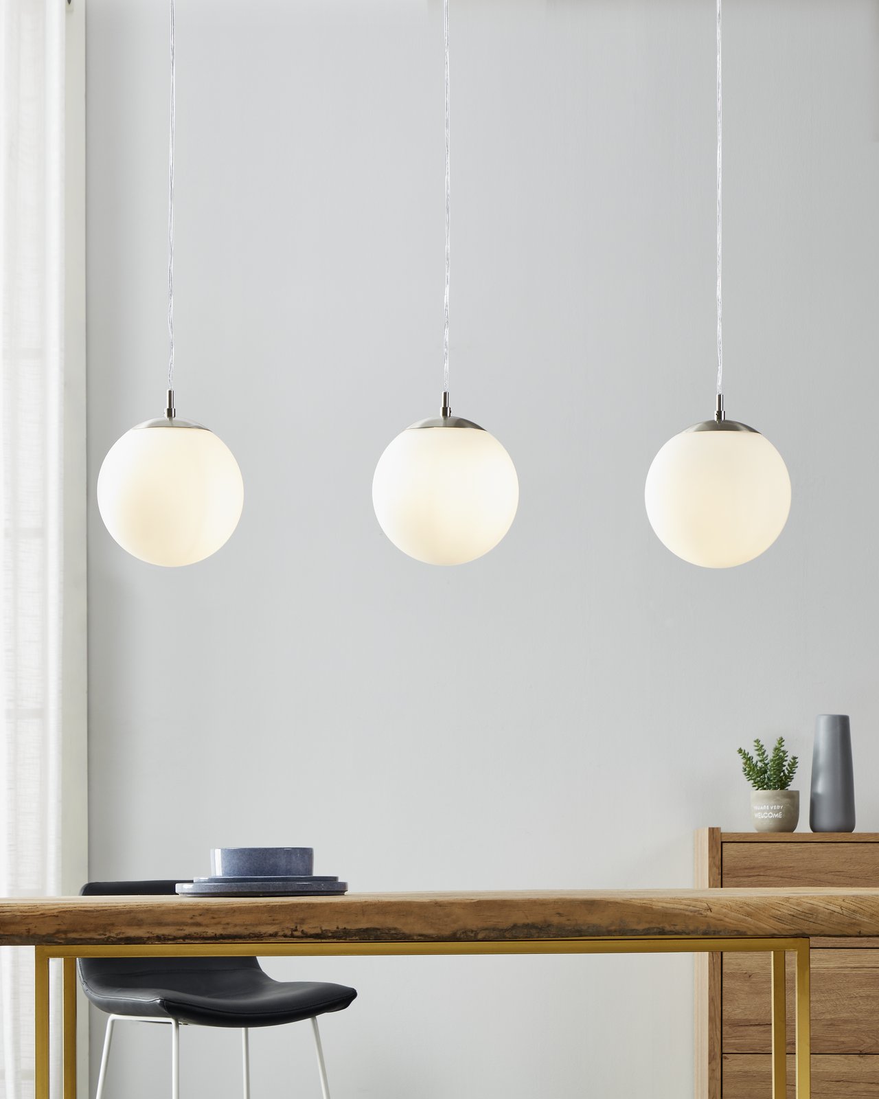 Moderní lustry do kuchyně, jídelny nebo do obývacího pokoje. Vyjímat se budou v kuchyni nad kuchyňským ostrůvkem nebo v jídelně nad jídelním stolem. Jsou vyrobeny z oceli a stínidla ve tvaru koule jsou z matného opálového skla. |