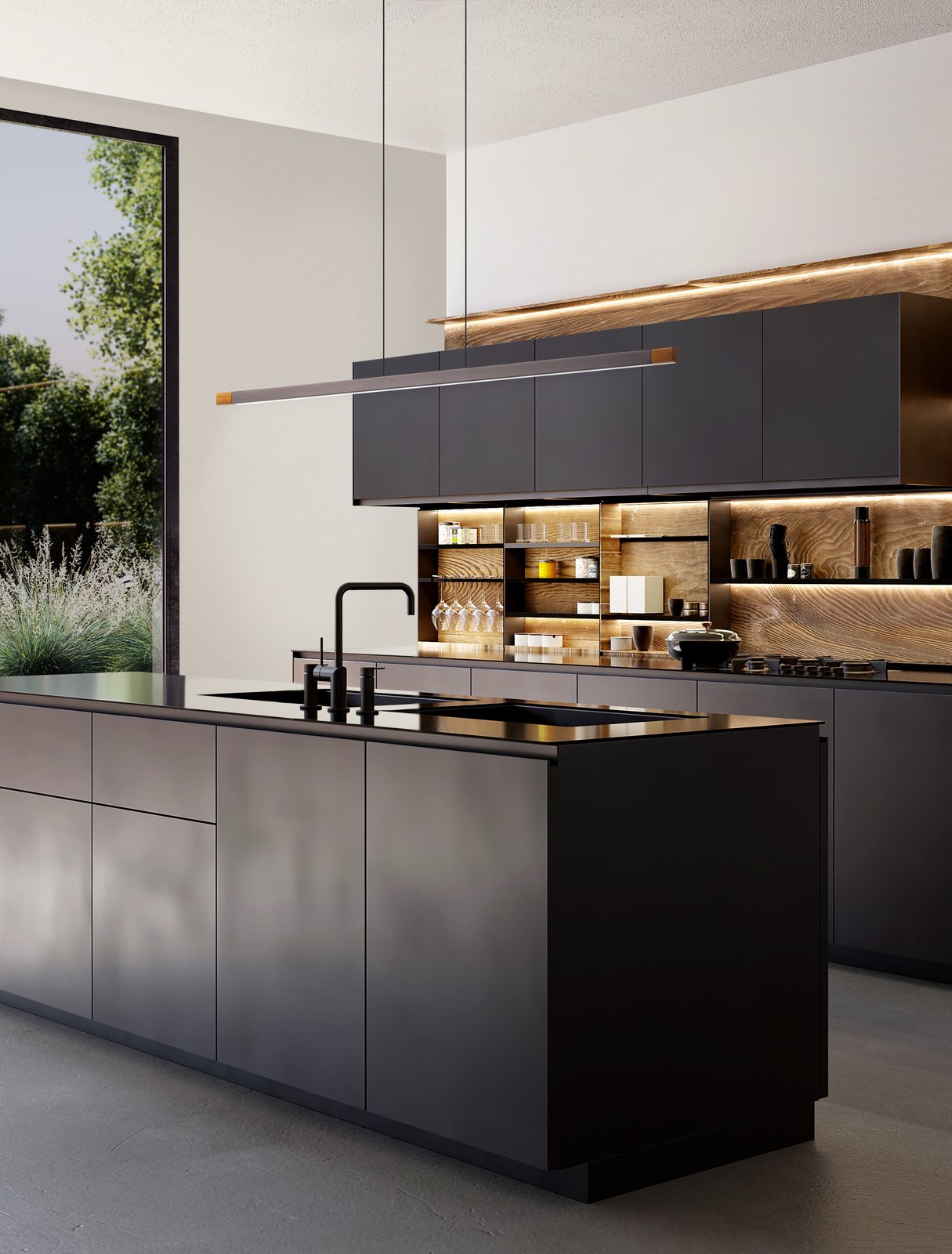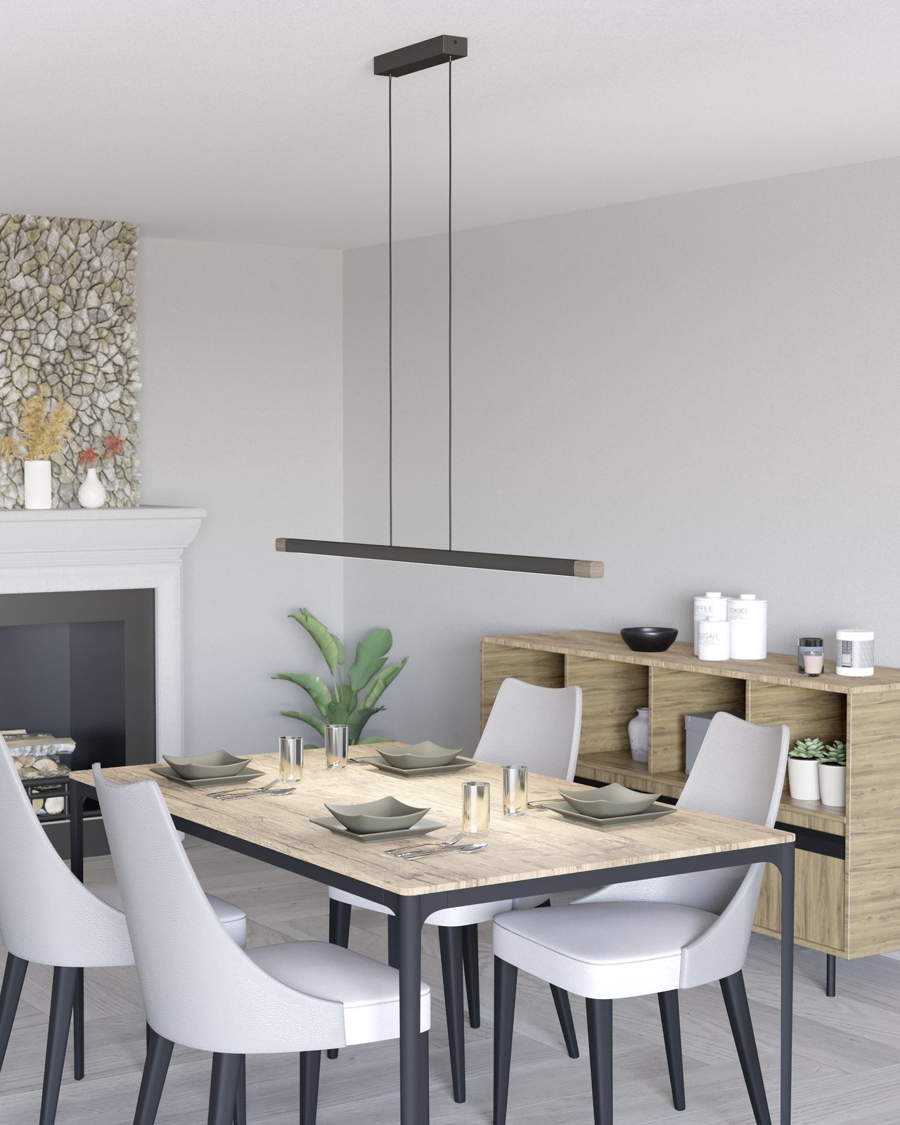 Moderní lustry do kuchyně nad kuchyňský ostrůvek nebo kuchyňský stůl. Jsou vyrobeny z hliníku a oceli v šedé barvě s dřeveným detailem na konci svítidla, a z plastu v bílé barvě. Svítí teplou bílou barvou a je možné je stmívat.