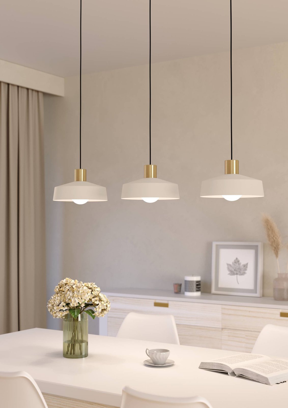 Moderní závěsná svítidla vyrobená z oceli v pískové barvě s prvky mosazné. Je možné je osadit chytrými LED žárovkami a pomocí aplikace v chytrém telefonu je stmívat a měnit teplotu a barvu svícení. Jsou vhodná nejen do kuchyní a jídelen, ale také do obývacích pokojů.
