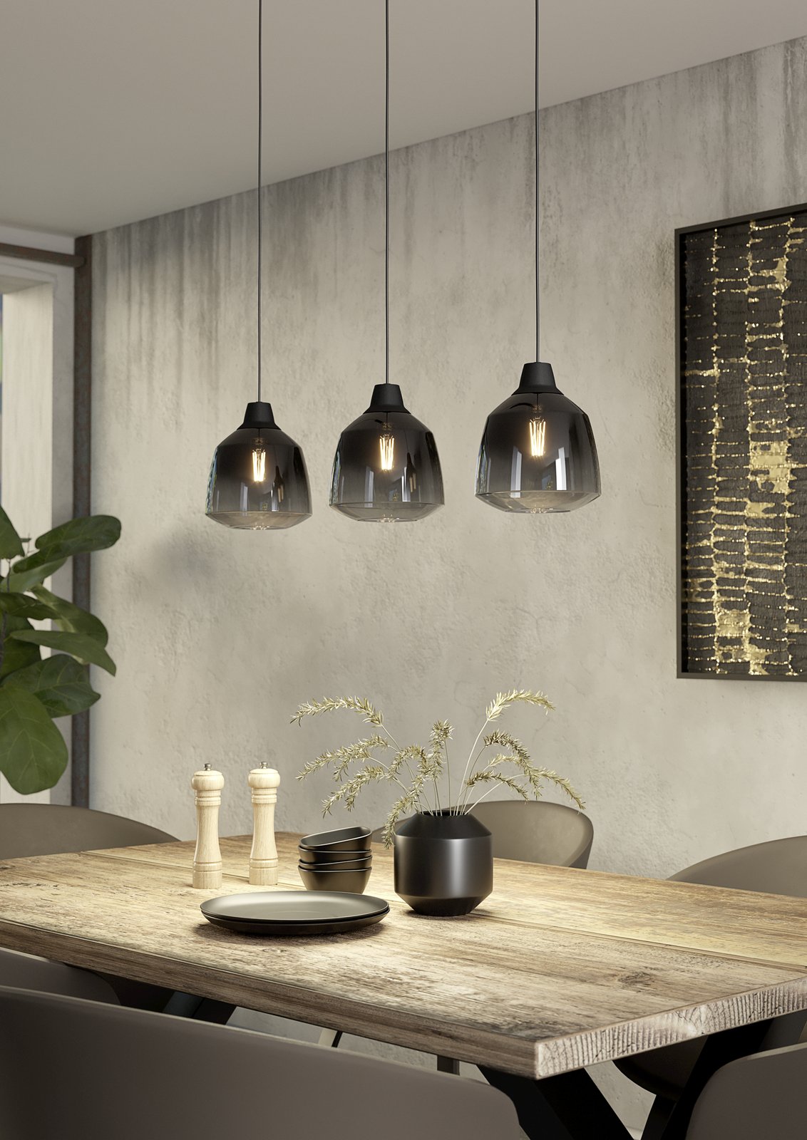 Zajímavé a moderní lustry z oceli v černé barvě a stínidla jsou z kouřového skla. Lze je osadit do obývacích pokojů, ale také jídelen nad jídelní stůl či kuchyně nad kuchyňský ostrůvek. |