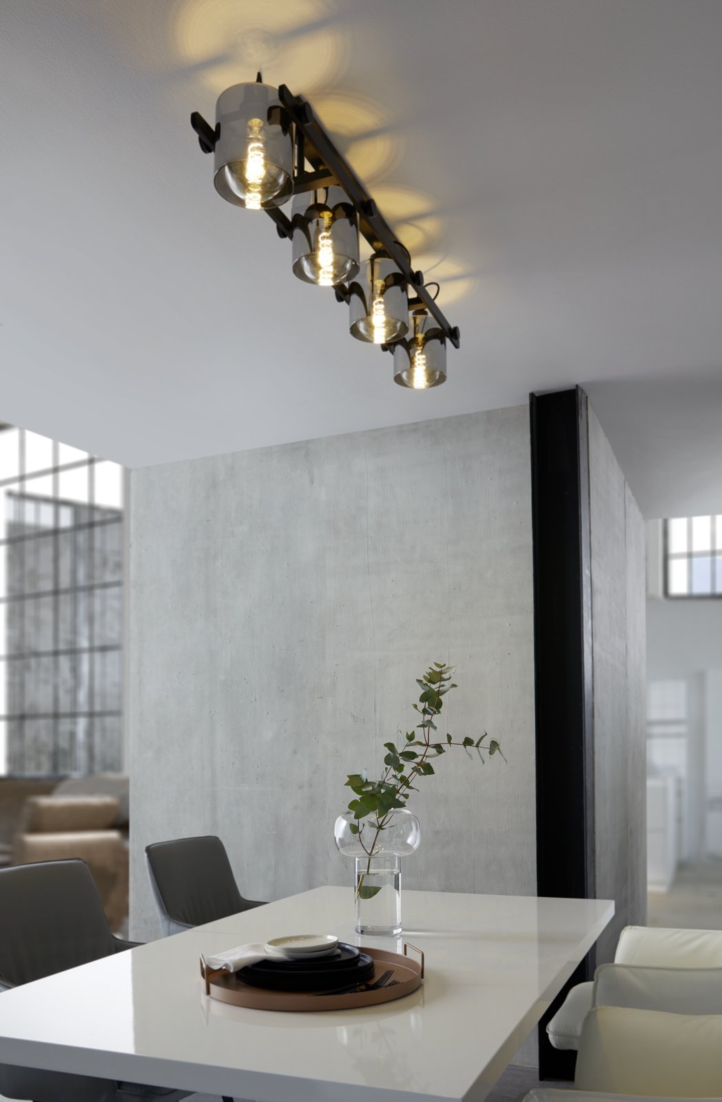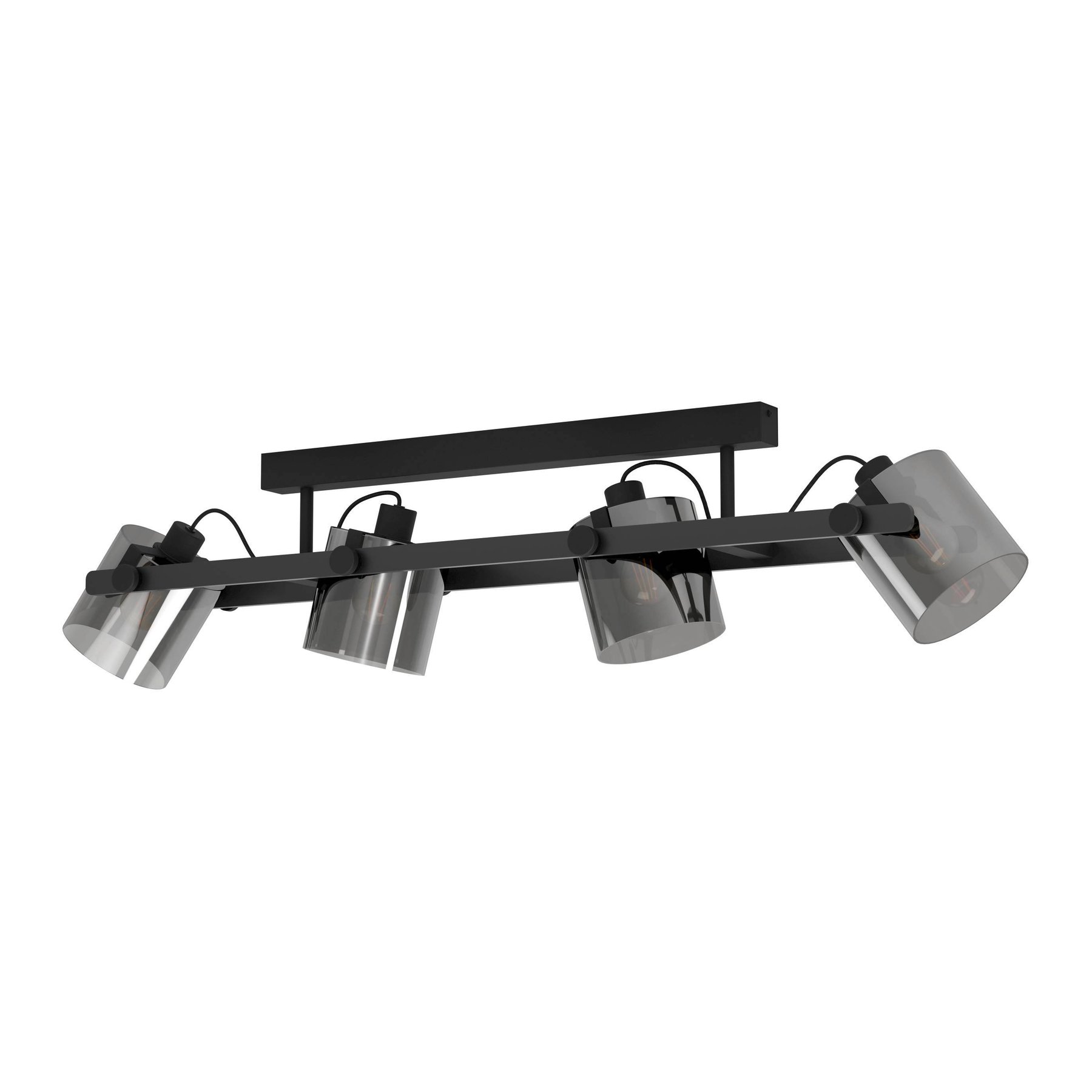 Moderní, stylová svítidla vyrobená z oceli v černé barvě a z kouřového skla. Hlavy, které jsou umístěné na základně jsou pohyblivé do stran a je možné je natočit tam, kam zrovna potřebujete svítit. |