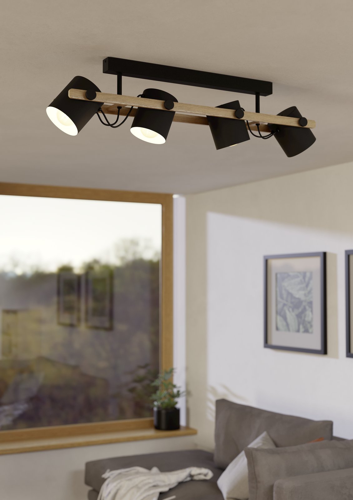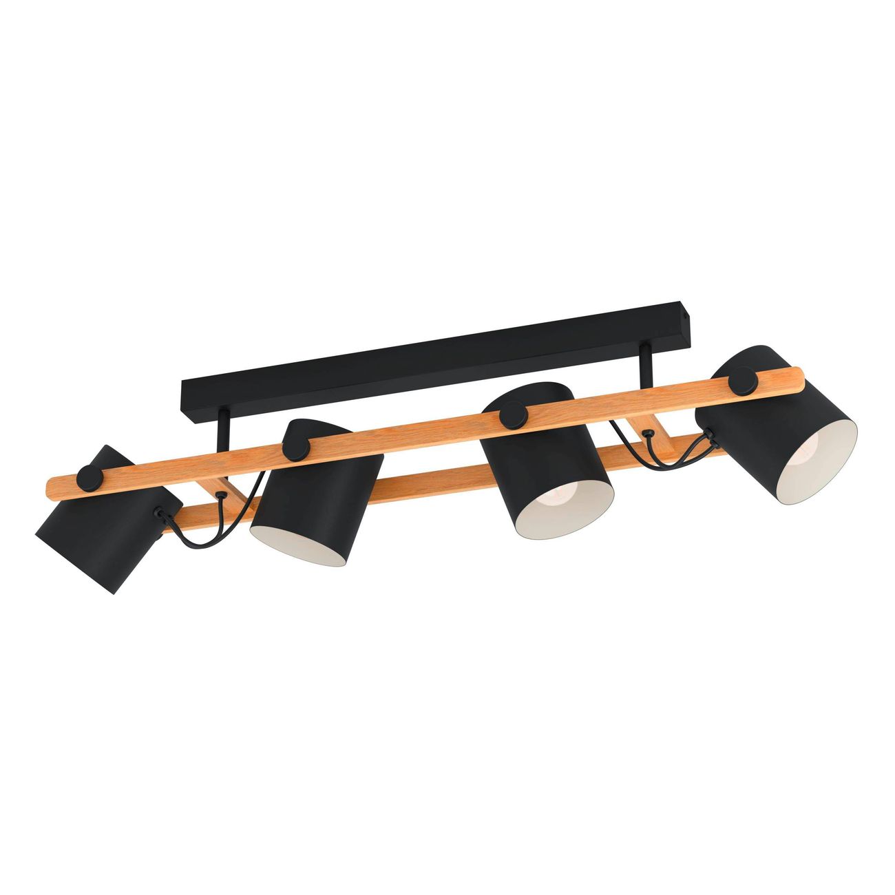 Moderní, stylová svítidla vyrobená z oceli v černé a krémové barvě a ze dřeva v hnědé barvě. Hlavy, které jsou umístěné na dřevěné základně jsou pohyblivé do stran a je možné je natočit tam, kam zrovna potřebujete svítit. |