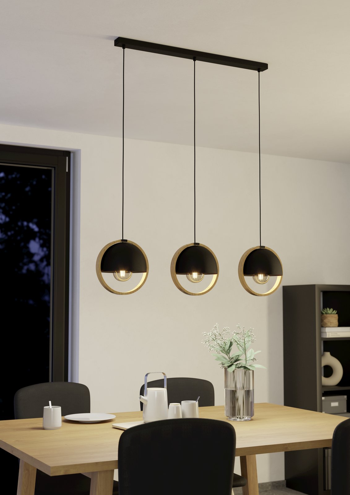 Závěsná svítidla Callow jsou vyrobena z oceli v černé barvě a dřevěného rámečku v hnědé barvě. Svítidla je vhodné zavěsit např. nad jídelní stůl, kde budou vkusným prvkem jídelního koutu. |