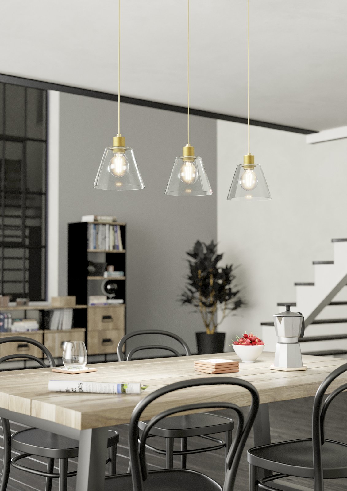 Moderní lustry vyrobené z oceli a hliníku ve zlaté barvě a ze skla v čiré barvě. Hodí se nejen do obývacích pokojů, ale i kuchyní a jídelen nad jídelní stůl nebo nad kuchyňský ostrůvek. |