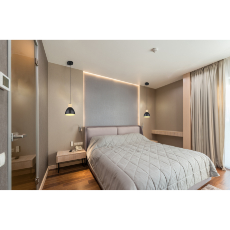 Moderní lustry vyrobené z matného černého kovu a imitace dřevěných prvků. Kabely jsou výškově nastavitelné. Lze je osadit chytrou LED žárovkou a měnit tak intenzitu a barvu světla. |
