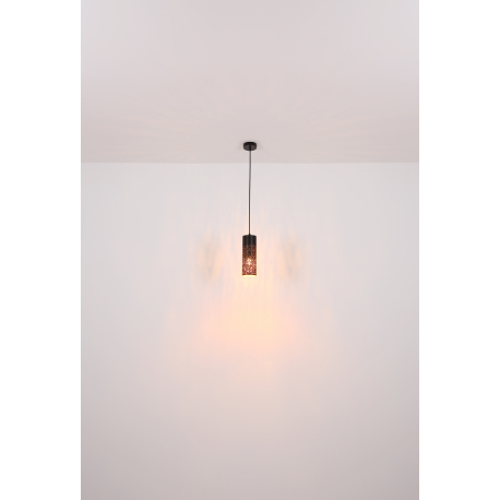 Moderní lustry vhodné do kuchyně nebo jídelny nad jídelní stůl nebo kuchyňský ostrůvek, ale také do obývacího pokoje. Jsou vyrobeny z kovu v elegantní matné černé a zlaté barvě, stínidla jsou zavěšena na textilním kabelu. Stínidlo je děrované, což po rozsvícení vypadá velmi efektně. |