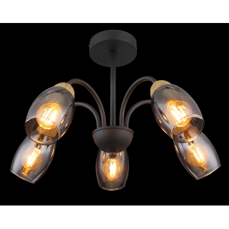 GL-60297-5D Stropní svítidlo kov černý matný, sklo kouřové, kov imitace dřeva, Ø:470mm, V:290mm, bez žárovek 5xE14 25W 230V - Gerly