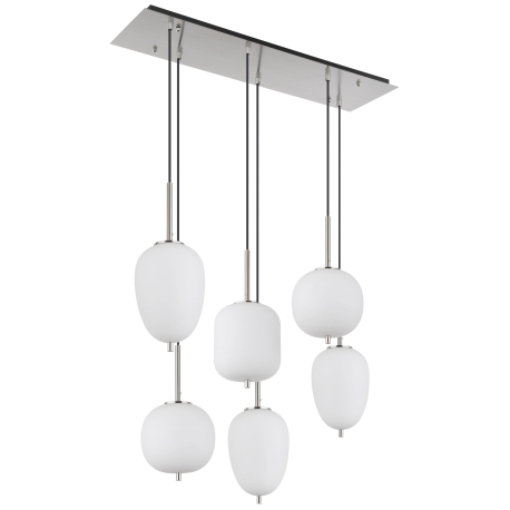 GL-15345-6NO Závěsné svítidlo kov nikl matný, sklo bílé, kabel PVC černý, možnost nastavení výšky, 3 různá skla, Dx?xV:800x340x1200mm, Ø:stínítka: 2x15,8cm, 16,5cm, 18,5cm, bez žárovek 6x E14 40W 230V - Blacky Globo