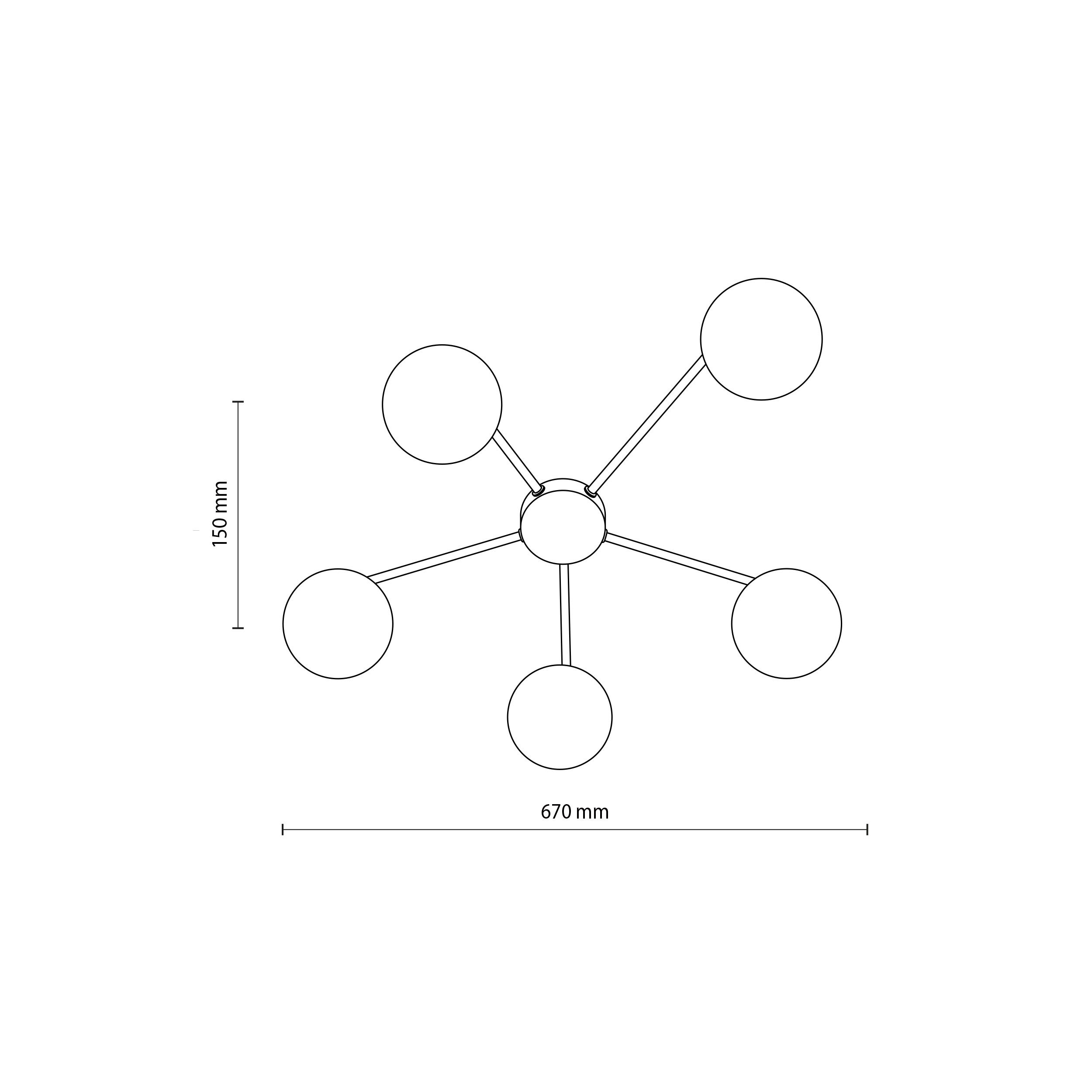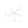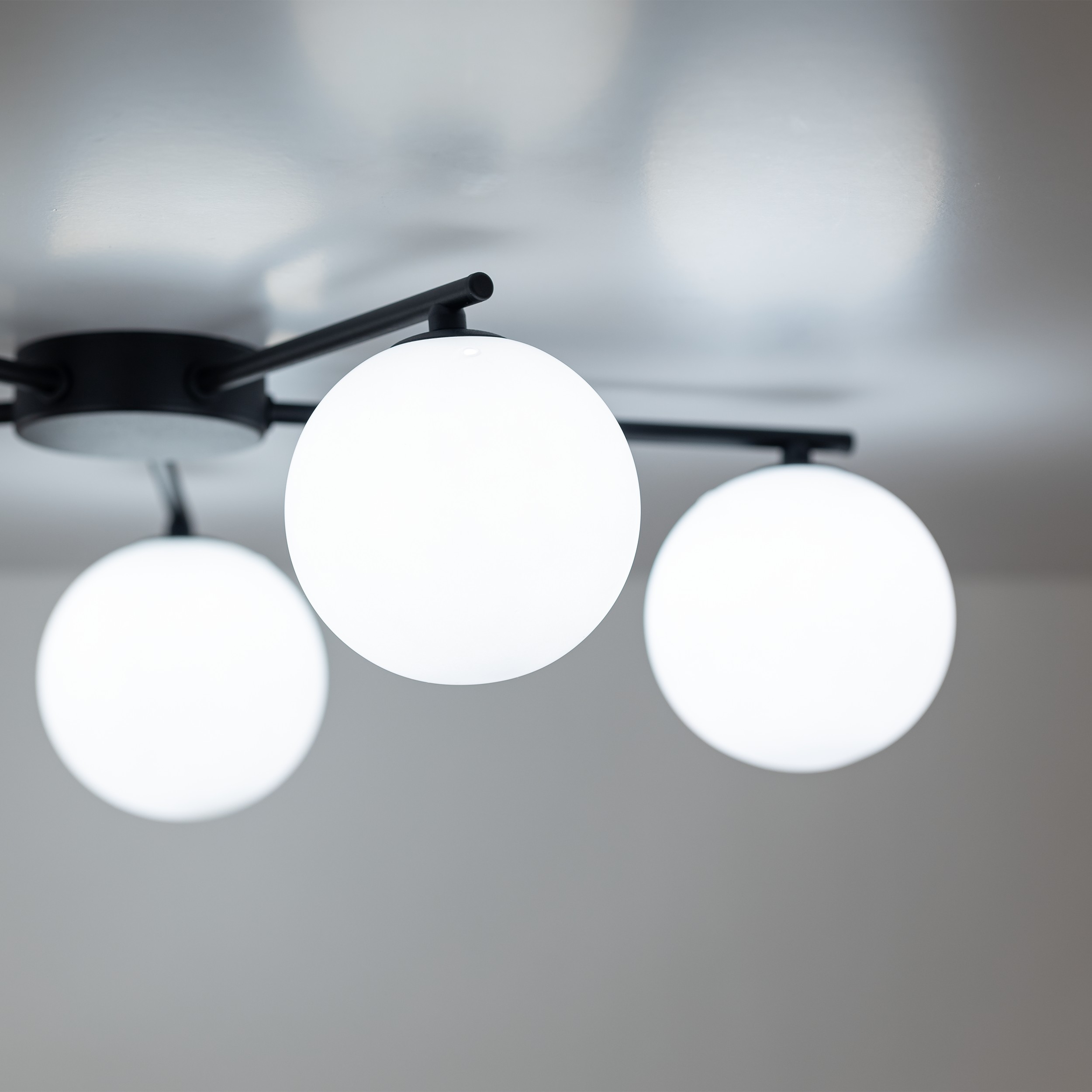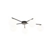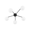 Moderní stropní svítidla vyrobená z kovu, skla a plastu v elegantní černé barvě. Kovová základna má na ramena, na kterých jsou zavěšeny skleněné koule. |