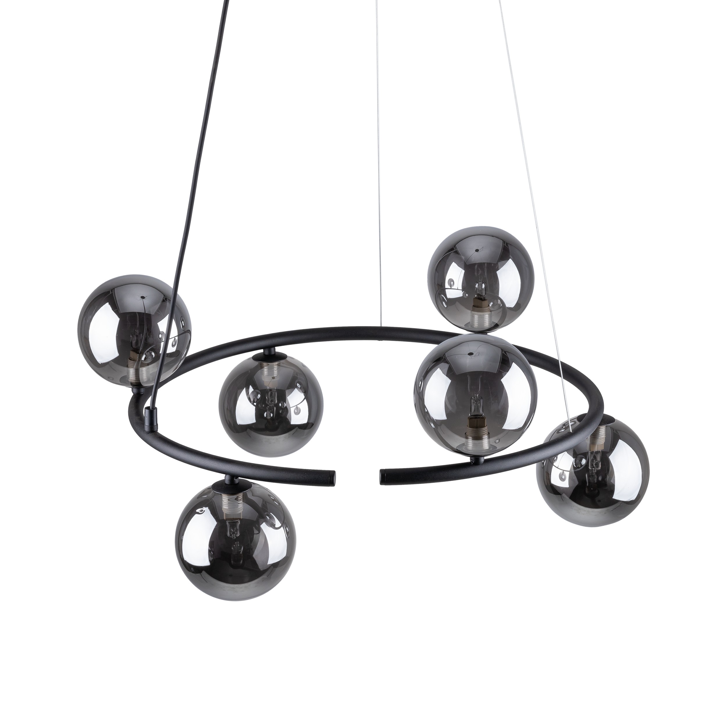 Zajímavé lustry vyrobené z kovu, plastu a skla. Působí luxusním dojmem. Ve vašem interéru budou tvořit zajímavý prvek. Na černé základně jsou umístěny skleněné koule v černé barvě. |