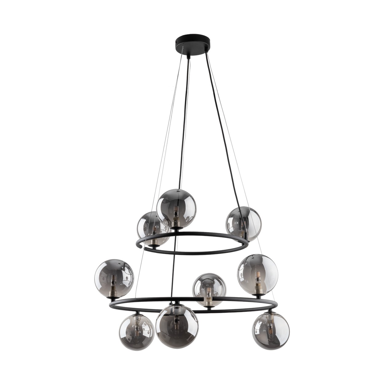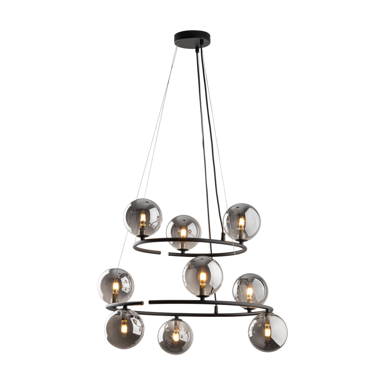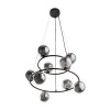 Zajímavé lustry vyrobené z kovu, plastu a skla. Působí luxusním dojmem. Ve vašem interéru budou tvořit zajímavý prvek. Na černé základně jsou umístěny skleněné koule v černé barvě. |