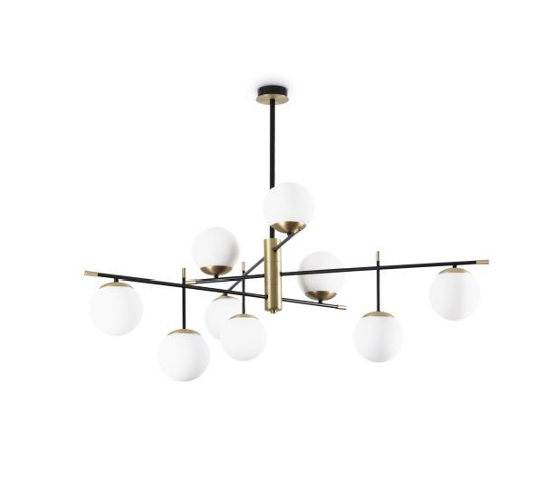 Elegantní závěsná svítidla vyrobená z kovu a skla. Základna svítidla je v matné černé barvě, doplněná o matnou mosaznou, skleněné koule stínidel jsou v bílé barvě. Jsou vhodná do obývacích pokojů, kuchyní, ložnic, předsíní apod. |