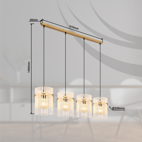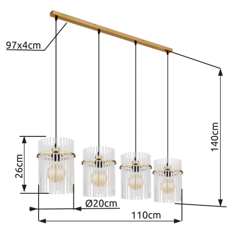 GL-15698-4HM  Závěsné svítidlo, kov zlaté barvy, skleněné tyče bílé, průhledné, kabel PVC černý, možnost zkrácení výšky, Dx?xV:1100x200x1400mm, bez žárovek 4xE27, Max. 60W 230V - Gorley gold