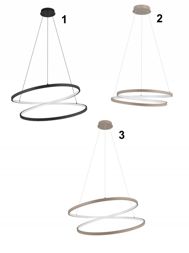 Moderní závěsná svítidla vyrobená z hliníku, oceli a plastu. Svítí teplou bílou barvou, což v interiéru působí příjemným dojmem. Svítidla není možné stmívat. |