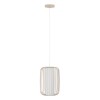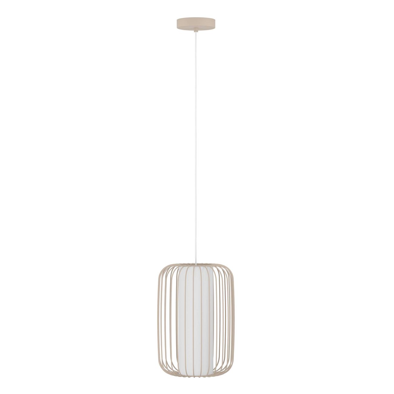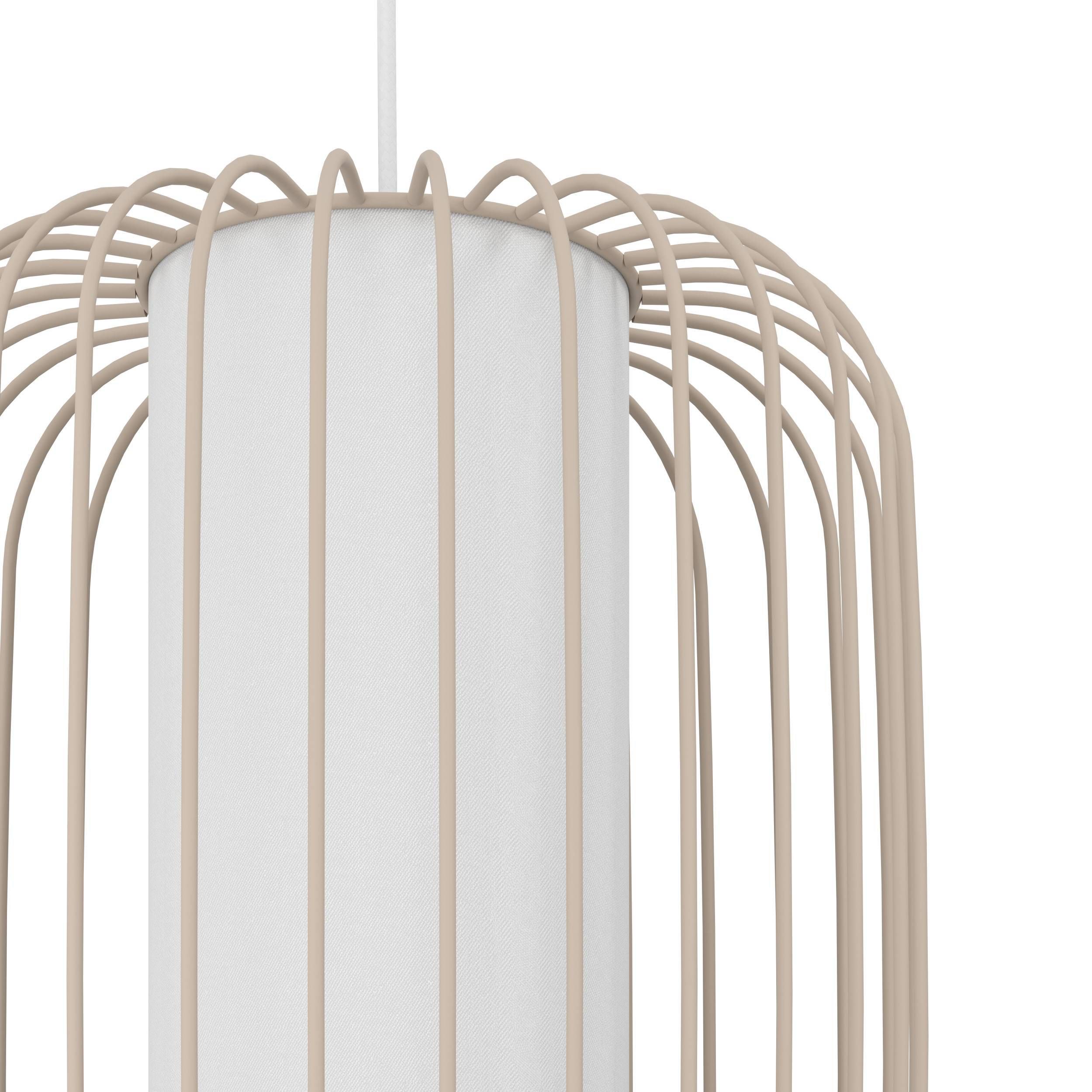 Moderní závěsná svítidla vyrobená z oceli v pískové barvě s textilním válcem v bílé barvě uprostřed kovového stínidla. |