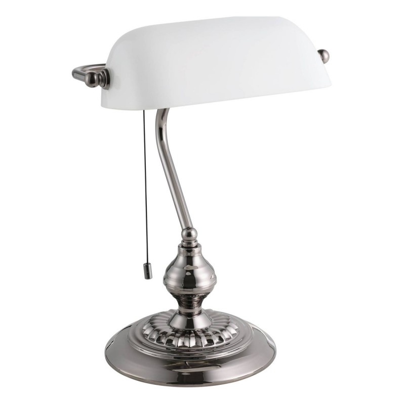 Stolní lampička, vhodná do kanceláří a pracoven. Styl bankovní. Je vyrobena z kovu v barvě matný nikl nero a stínidlo je z bílého saténového skla. S vypínačem.