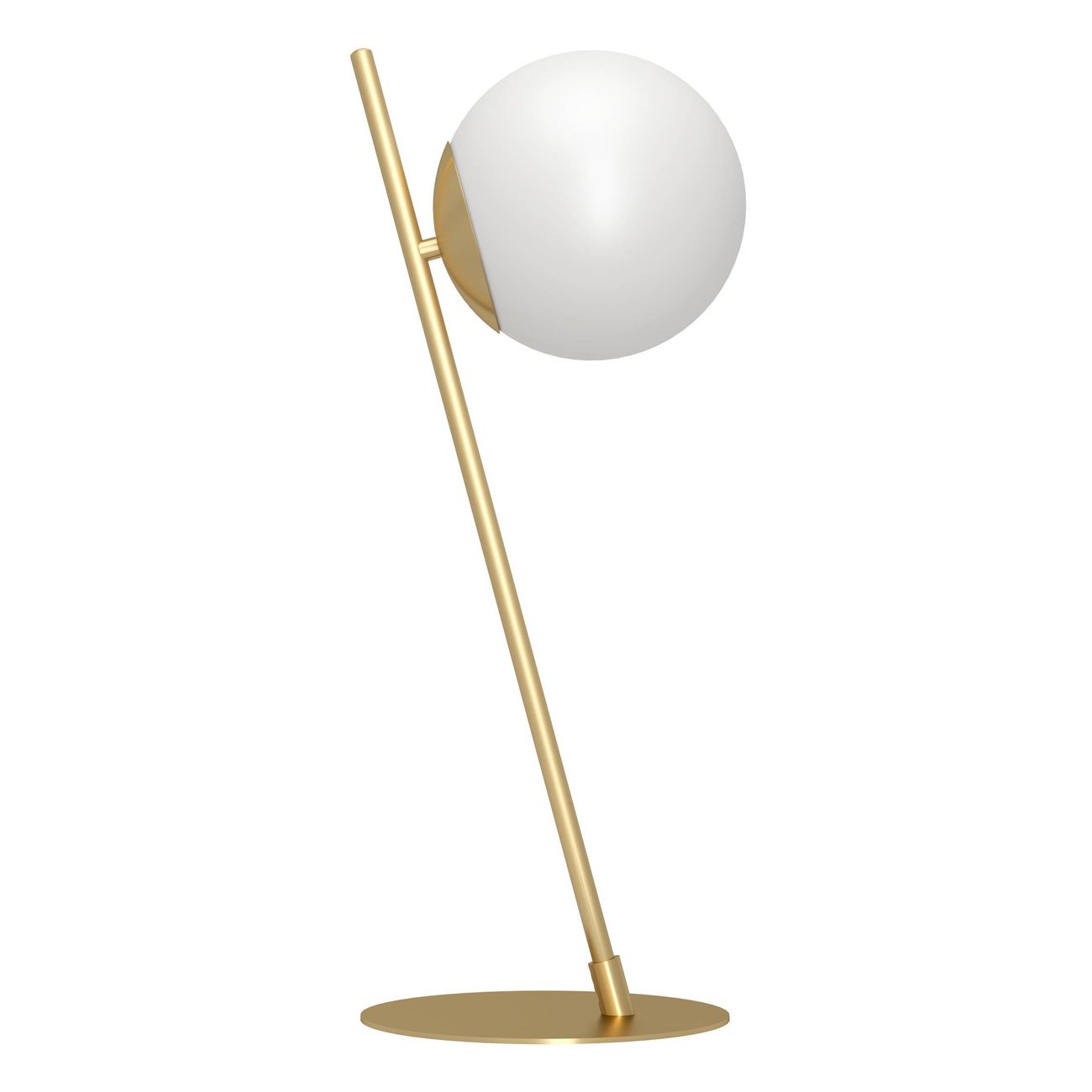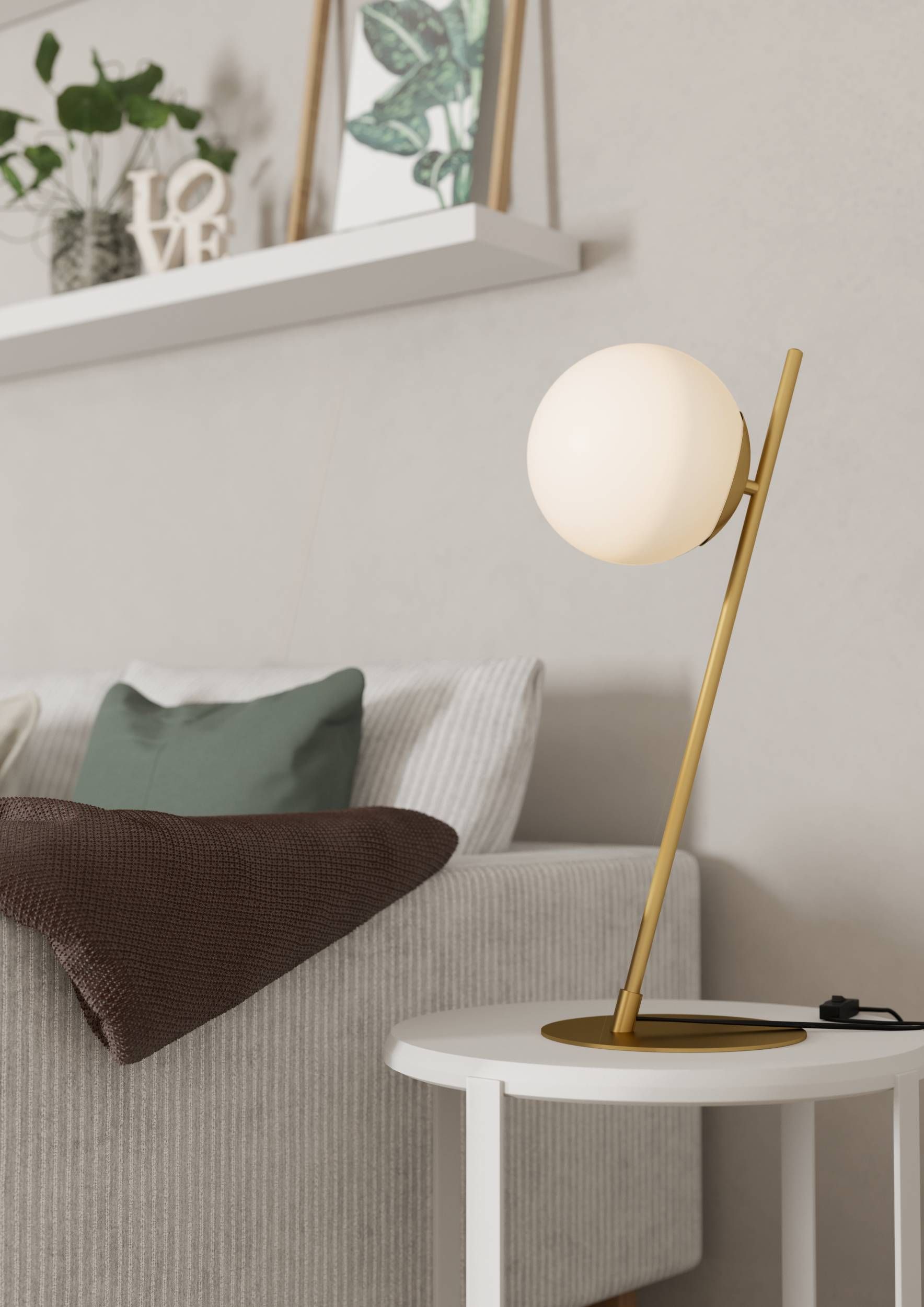 Elegantní svítidla vyrobená z oceli v kartáčované mosazi a stínidla jsou skleněné koule v matné opálové barvě. |