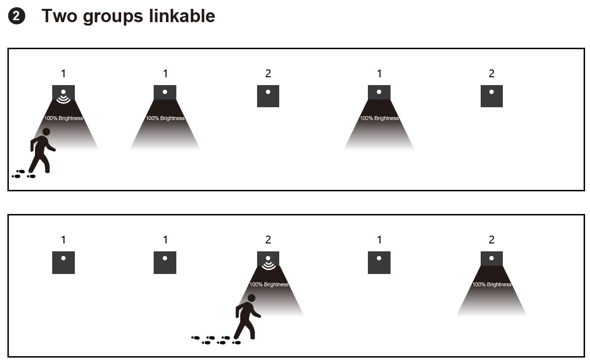 MÓD 1 – skupinové spínání svítidel se shodně nastaveným módem (1). Světlo které detekuje pohyb se rozsvítí a současně se rozsvítí všechna svítidla u kterých jsme nastavili mod 1 (vyšle bezdrátově impuls těmto svítidlům)
