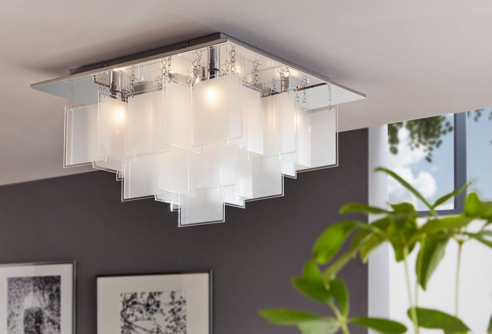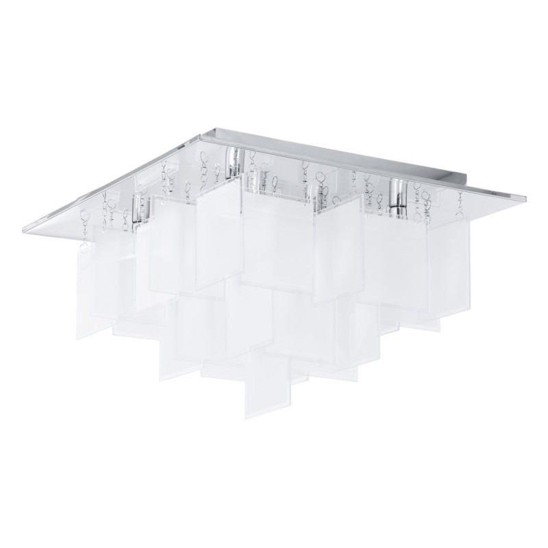 Hranaté stropní svítidlo vyrobené z oceli v barvě chromu a ze skla v barvě satinová bílá. Dodává se včetně žárovek se závitem G9. |