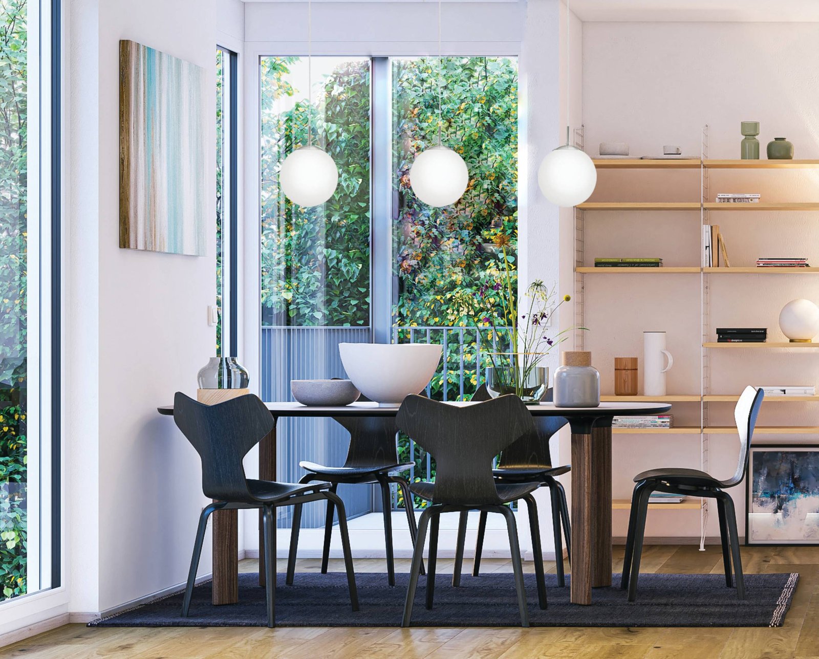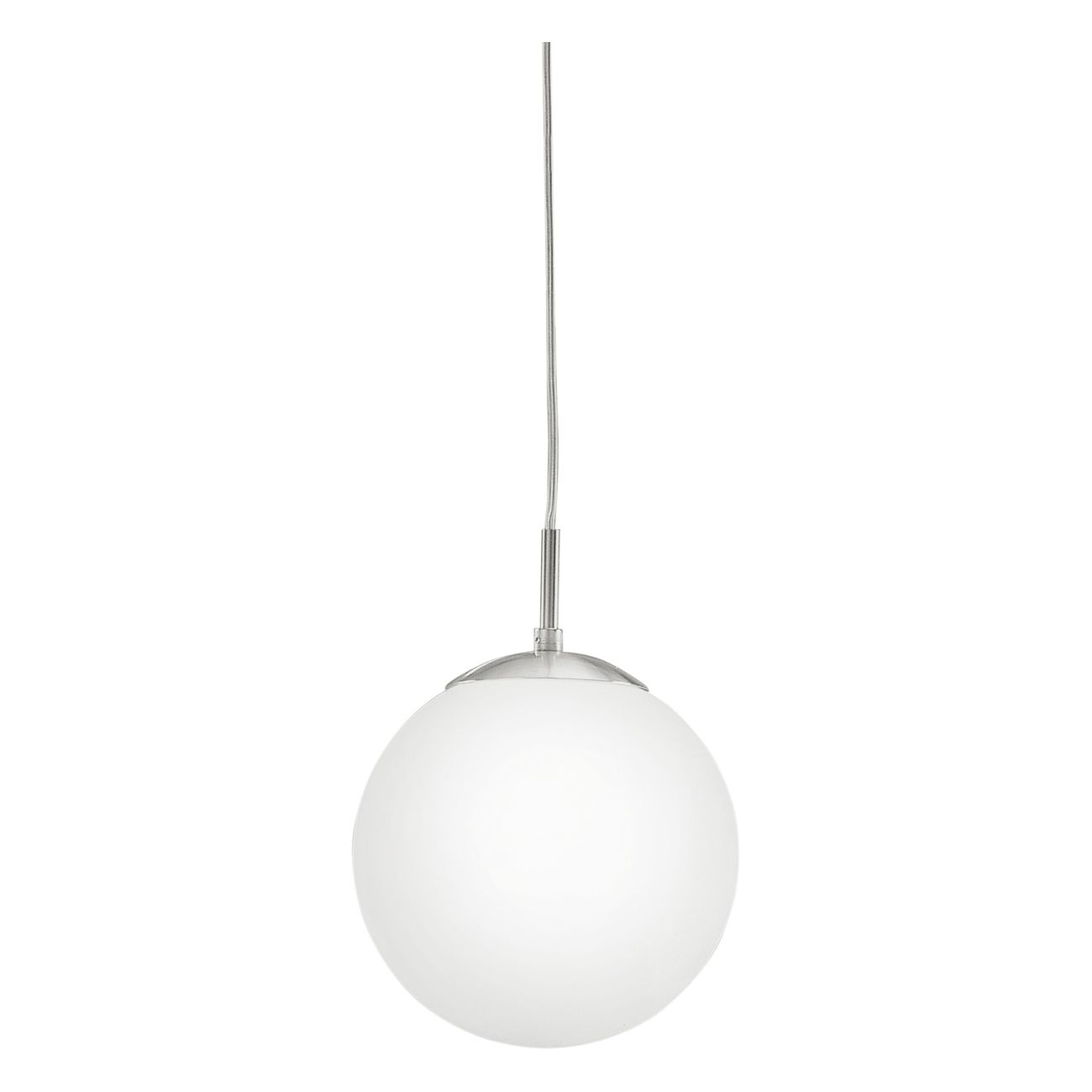 Moderní sada svítidel vyrobených z oceli v matném niklu a opálových skleněných koulí v bílé barvě. |