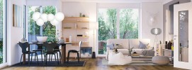 Moderní sada svítidel vyrobených z oceli v matném niklu a opálových skleněných koulí v bílé barvě. |