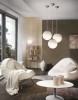 Moderní sada svítidel vyrobených z oceli v matném niklu a opálových skleněných koulí v bílé barvě. |