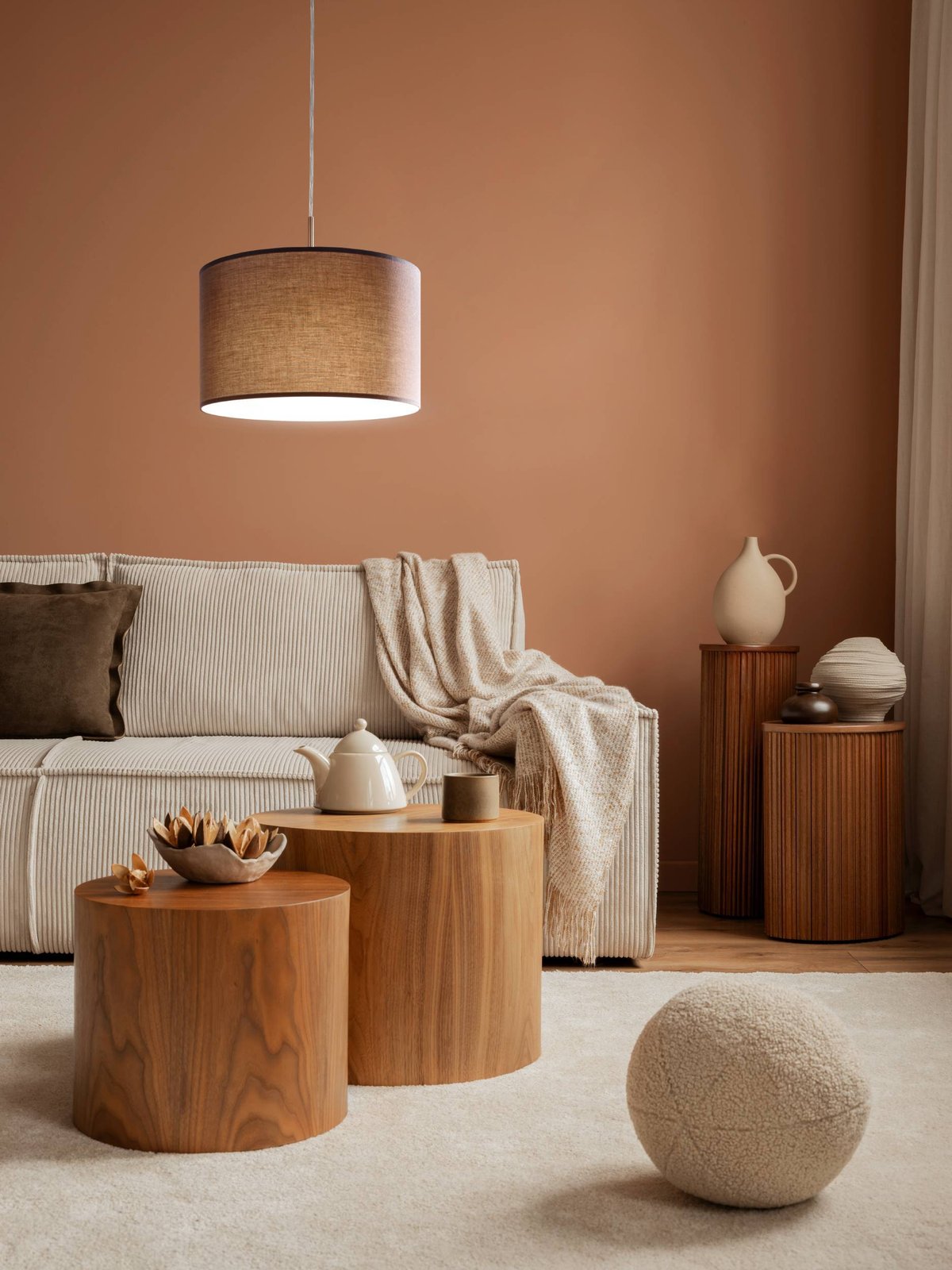 Moderní sada svítidel je vyrobena z kovu v matném niklu a stínidlo je textilní v hnědo-antracitové barvě. |