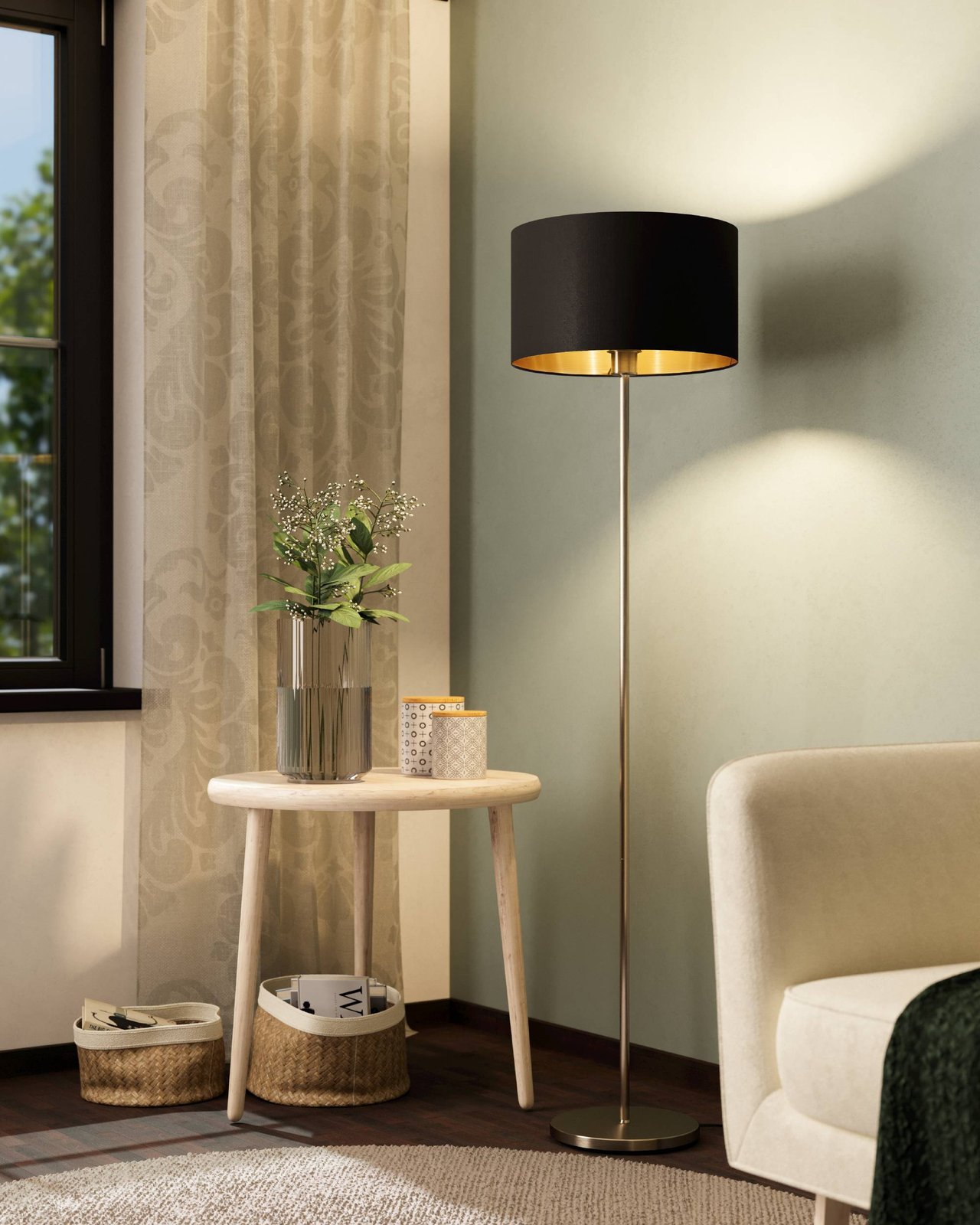 Maserlo jsou svítidla v moderním designu. Jsou vyrobena z oceli v barvě matný nikl a stínidlo je textilní, z vnitřní strany ve zlaté barvě a z venkovní strany v černé barvě. |