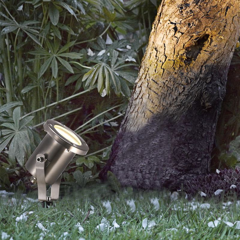 | Jednoduché bodové venkovní zemní svítidlo z nerez oceli s možností nastavení úhlu světla se zápichem ke snadné instalaci do trávníku | |
