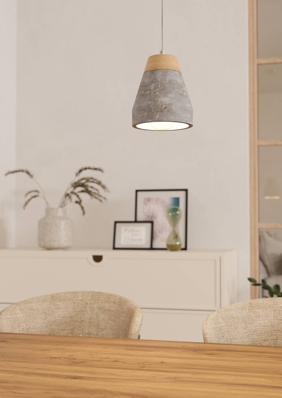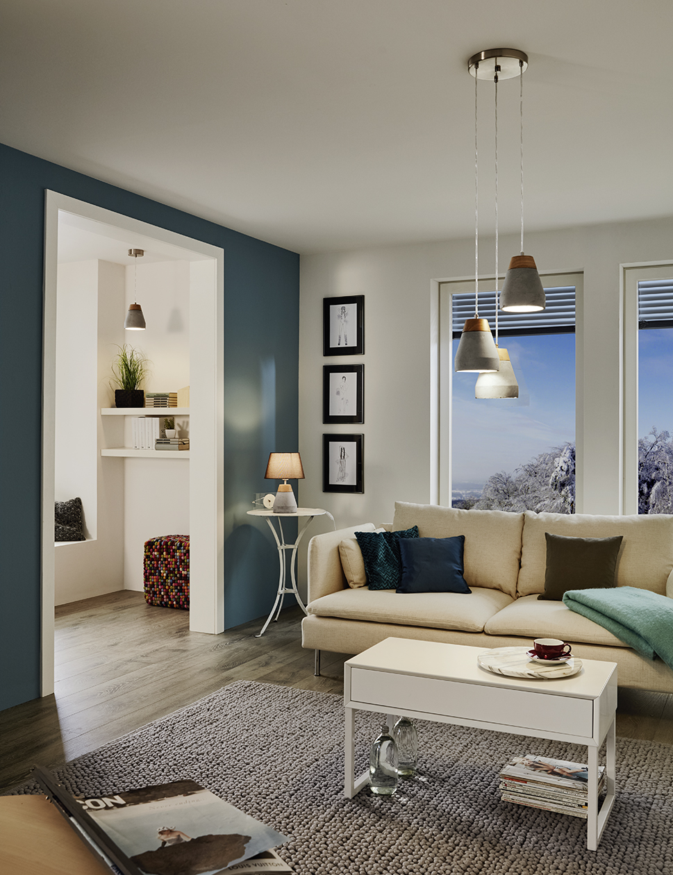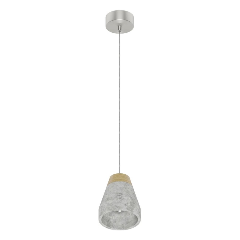 Moderní závěsná svítidla vhodná do kuchyní, jídelen i obývacích pokojů. Jsou vyrobena z oceli v šedé barvě a stínidlo je betonové, v šedé barvě s dřevěným hnědým detailem. |